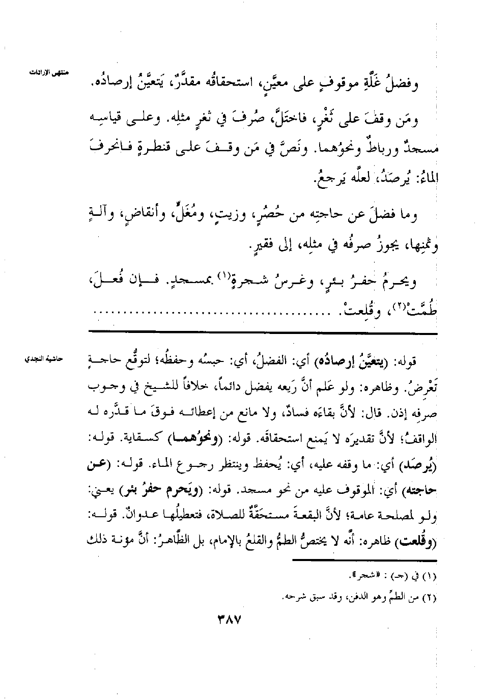 وَفَضْلُ غَلَّةٍ مَوْقُوفٌ عَلَى مُعَيَّنٍ اسْتِحْقَاقُهُ مُقَدَّرٌ يَتَعَيَّنُ إرْصَادُهُ وَمَنْ وَقَفَ عَلَى ثَغْرٍ فَاخْتَلَّ صَرَفَ فِي ثَغْرٍ مِثْلِهِ وَعَلَى قِيَامِهِ مَسْجِدٌ وَرِبَاطٌ وَنَحْوُهُمَا وَنَصَّ فِي مَنْ وَقَفَ عَلَى قَنْطَرَةٍ فَانْحَرَفَ الْمَاءُ بِرَصْدٍ لَعَلَّهُ يَرْجِعُ وَمَا فَضَلَ عَنْ حَاجَتِهِ مِنْ حُصْرِ وَزَيْتٍ وَمَغَلٍّ وَأَنْقَاضٍ وَآلَةٍ وَثَمَنِهَا يَجُوزُ صَرْفُهُ فِي مِثْلِهِ وإلَى فَقِيرٍ وَيَحْرُمُ حَفْرُ بِئْرٍ وغَرْسُ شَجَرَةٍ بِمَسْجِدٍ فَإِنْ فَعَلَ طُمَّتْ وَقُلِعَتْ