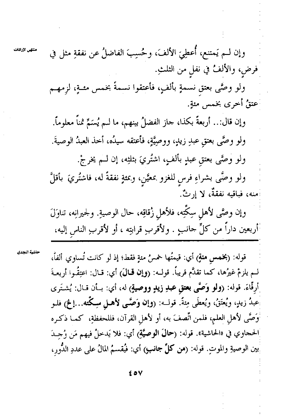 وإِنْ لَمْ يَمْتَنِعْ أَعْطَى الْأَلْفَ وَحُسِبَ الْفَاضِلُ عَنْ نَفَقَةِ مِثْلٍ فِي فَرْضٍ والْأَلْفُ فِي نَفْلٍ مِنْ الثُّلُثِ وَلَوْ وَصَّى بِعِتْقِ نَسَمَةٍ بِأَلْفٍ فَأَعْتَقُوا نَسَمَةً بِخَمْسِمِائَةٍ لَزِمَهُمْ عِتْقُ أُخْرَى بِخَمْسِمِائَةٍ وَإِنْ قَالَ أَرْبَعَةً بِكَذَا جَازَ الْفَضْلُ بَيْنَهُمْ مَا لَمْ يُسَمِّ ثَمَنًا مَعْلُومًا وَلَوْ وَصَّى بِعِتْقِ عَبْدِ زَيْدٍ وَصِيَّةً فَأَعْتَقَهُ سَيِّدُهُ أَخَذَ الْعَبْدُ الْوَصِيَّةَ وَلَوْ وَصَّى بِعِتْقِ مِثْلِ عَبْدٍ بِأَلْفٍ اُشْتُرِيَ بِثُلُثِهِ إنْ لَمْ يَخْرُجْ وَلَوْ وَصَّى بِشِرَاءِ فَرَسٍ لِلْغَزْوِ بِمُعَيَّنٍ وبِمِائَةٍ نَفَقَةً لَهُ فَاشْتُرِيَ بِأَقَلَّ مِنْهُ فَبَاقِيهِ نَفَقَةٌ لَا إرْثَ وَإِنْ وَصَّى لِأَهْلِ سِكَّتِهِ فلِأَهْلِ زُقَاقِهِ حَالَ الْوَصِيَّةِ ولِجِيرَانِهِ تَنَاوَلَ أَرْبَعِينَ دَارًا مِنْ كُلِّ جَانِبٍ ولِأَقْرَبِ قَرَابَتِهِ، أَوْ لِأَقْرَبِ النَّاسِ إلَيْهِ،