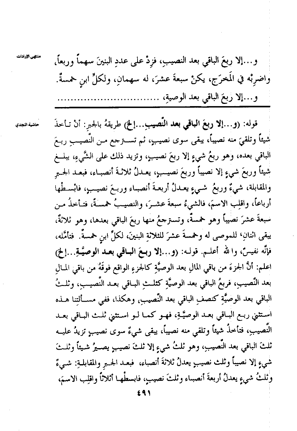 وإلَّا رُبْعَ الْبَاقِي بَعْدَ النَّصِيبِ فَزِدْ عَلَى عَدَدِ الْبَنِينَ سَهْمًا وَرُبْعًا وَاضْرِبْهُ فِي الْمَخْرَجِ يَكُنْ سَبْعَةَ عَشَرَ لَهُ سَهْمَانِ وَلِكُلِّ ابْنٍ خَمْسَةٌ، وإلَّا رُبْعَ الْبَاقِي بَعْدَ الْوَصِيَّةِ