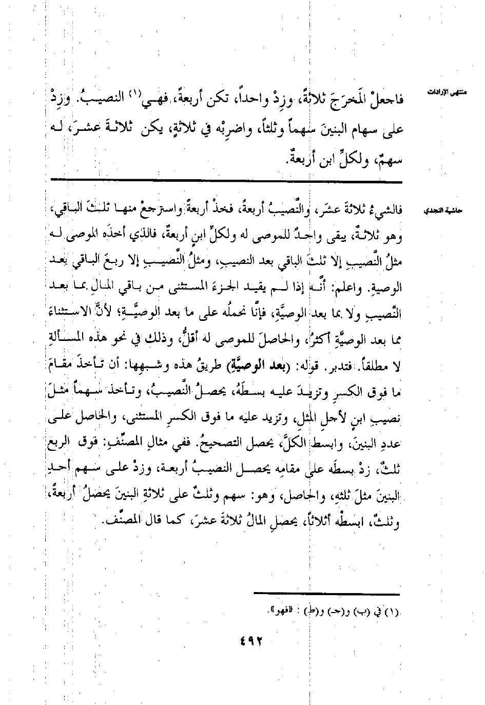 فَاجْعَلْ الْمَخْرَجَ ثَلَاثَةً وَزِدْ وَاحِدًا تَكُنْ أَرْبَعَةً فَهُوَ النَّصِيبُ، وَزِدْ عَلَى سِهَامِ الْبَنِينَ سَهْمًا وثُلُثًا وَاضْرِبْهُ يَكُنْ الضَّرْبِ لَهُ سَهْمٌ وَلِكُلِّ ابْنٍ أَرْبَعَةٌ