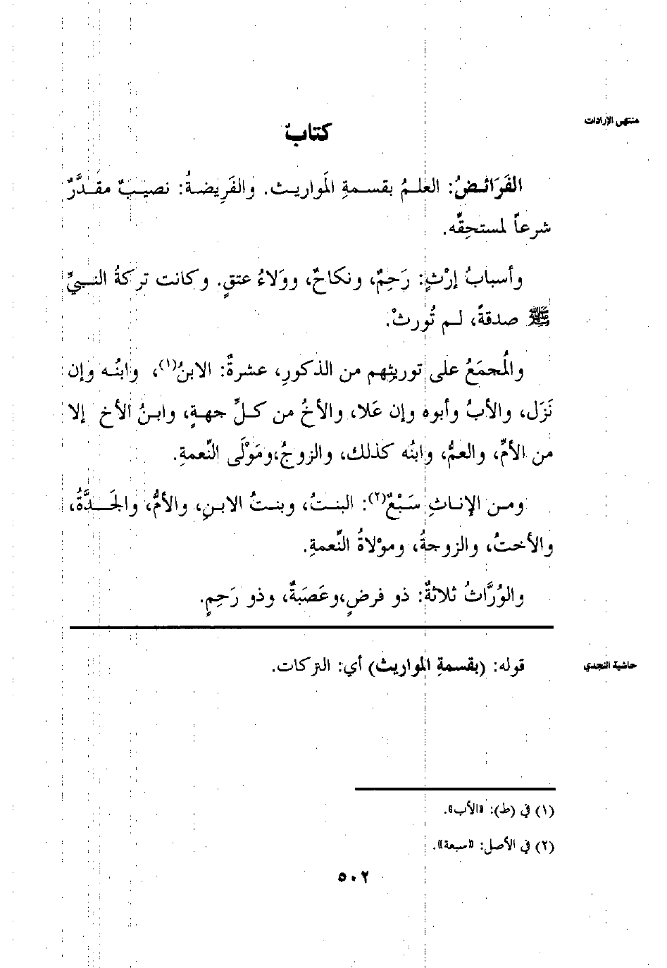 الْفَرَائِضِ الْعِلْمُ بِقِسْمَةِ الْمَوَارِيثِ وَالْفَرِيضَةُ نَصِيبٌ مُقَدَّرٌ شَرْعًا لِمُسْتَحِقِّهِ وَأَسْبَابُ إرْثٍ رَحِمٌ ونِكَاحٌ ووَلَاءُ عِتْقٍ وَكَانَتْ تَرِكَةُ النَّبِيِّ صَلَّى اللَّهُ عَلَيْهِ وَسَلَّمَ صَدَقَةً لَمْ تُوَرَّثْ وَالْمُجْمَعُ عَلَى تَوْرِيثِهِمْ مِنْ الذُّكُورِ عَشَرَةٌ الِابْنُ وَابْنُهُ وَإِنْ نَزَلَ وَالْأَبُ وَأَبُوهُ وَإِنْ عَلَا وَالْأَخُ مِنْ كُلِّ جِهَةٍ وَابْنُ الْأَخِ لَا مِنْ الْأُمِّ وَالْعَمُّ وَابْنُهُ كَذَلِكَ وَالزَّوْجُ وَمَوْلَى النِّعْمَةِ ومِنْ الْإِنَاثِ سَبْعٌ الْبِنْتُ وَبِنْتُ الِابْنِ وَالْأُمُّ وَالْجَدَّةُ وَالْأُخْتُ وَالزَّوْجَةُ وَمَوْلَاةُ النِّعْمَةِ وَالْوَارِثُ ثَلَاثَةُ ذُو فَرْضٍ وعَصَبَةٌ وذو رَحِمٍ