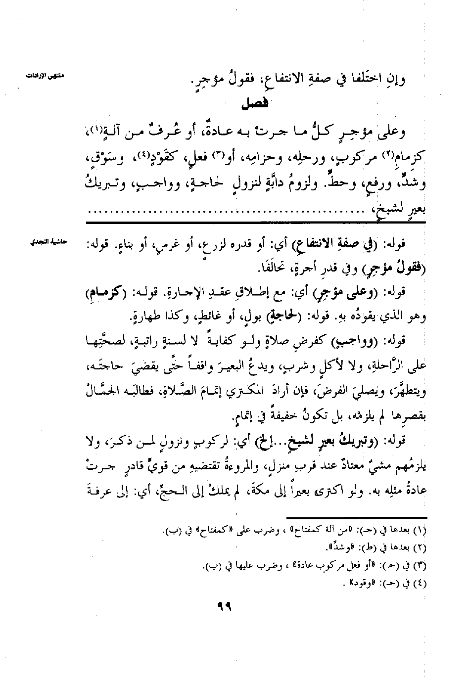 وعلى مؤجر كل ما جرت به عادة أو عرف من آله كزمام مركوب وَرَحْلِهِ وَحِزَامِهِ أَوْ فِعْلٍ كَقَوْدٍ وَسَوْقٍ وَرَفْعٍ وَشَدٍّ وَحَطٍّ وَلُزُومِ دَابَّةٍ لِنُزُولِ الْحَاجَةِ وَوَاجِبٍ وتَبْرِيكُ بَعِيرٍ لشيخٍ