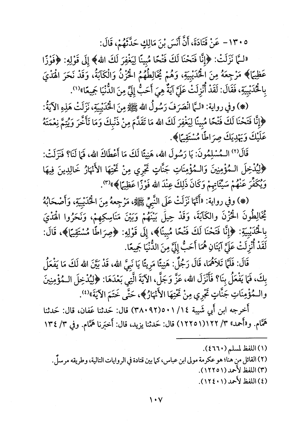 - وفي رواية: «لما انصرف رسول الله صَلى الله عَليه وسَلم من الحُدَيبيَة، نزلت هذه الآية: {إنا فتحنا لك فتحا مبينا. ليغفر لك الله ما تقدم من ذنبك وما تأخر. ويتم نعمته عليك ويهديك صراطا مستقيما}.