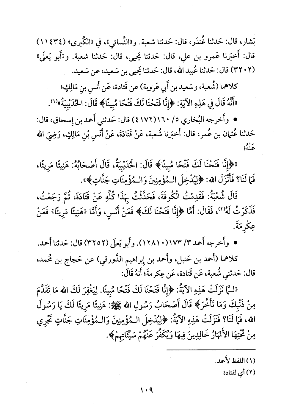 وقال شعبة: كان قتادة يذكر هذا الحديث في قصصه، عن أَنس قال: نزلت هذه الآية لما رجع رسول الله صَلى الله عَليه وسَلم من الحُدَيبيَة {إنا فتحنا لك فتحا مبينا. ليغفر لك الله ما تقدم من ذنبك وما تأخر}، ثم يقول: قال أصحاب رسول الله صَلى الله عَليه وسَلم: هنيئا لك ... هذا الحديث.