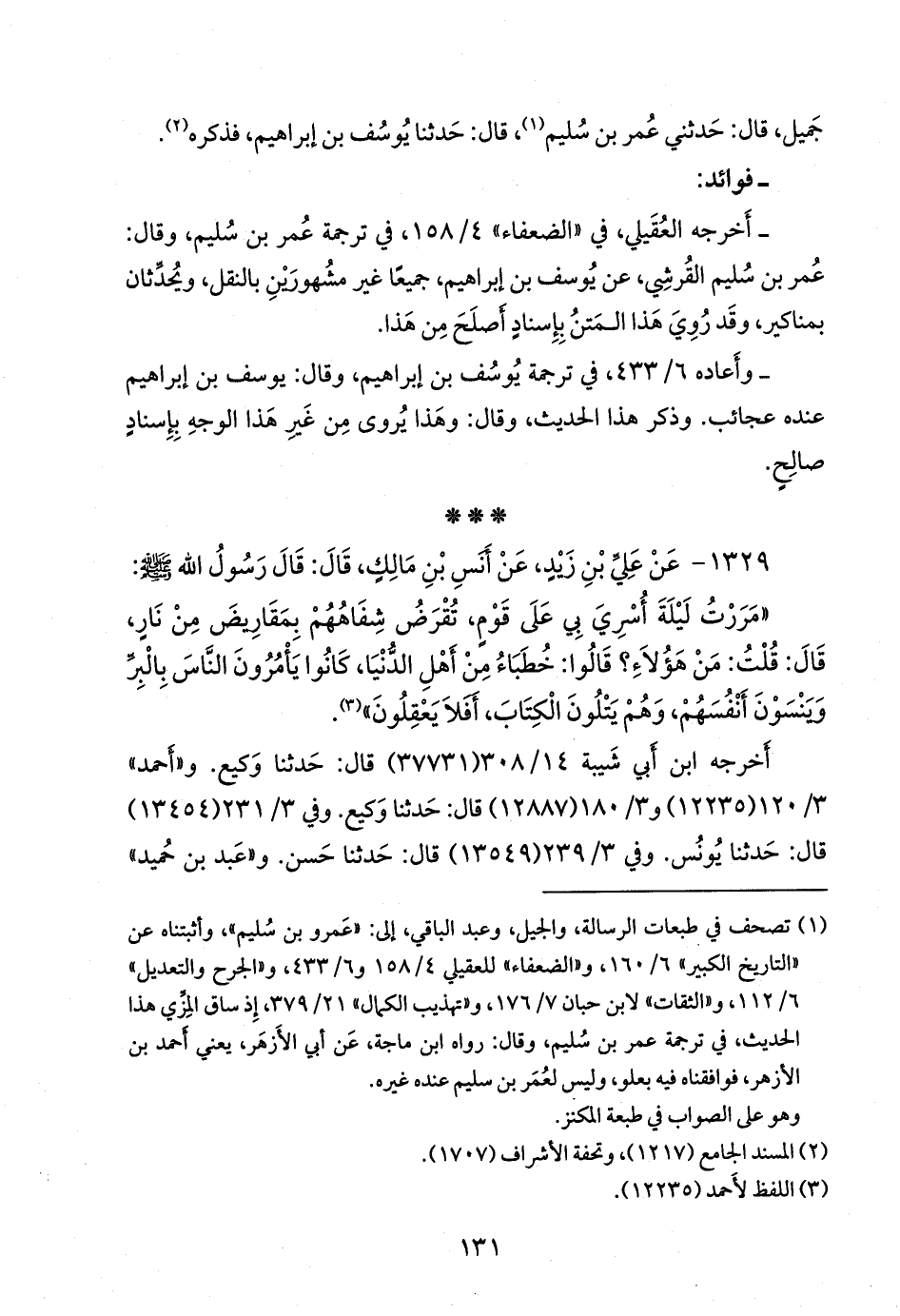- وأَخرجه العُقيلي أَيضًا في «الضعفاء» ٤/ ١٥٨، في مناكير عمر بن سُليم، وقال: عمر بن سُليم القرشي، عن يوسف بن إبراهيم، جميعًا غير مشُهورَيْن بالنقل، ويُحدِّثان بمناكير، وقد رُوي هذا المتنُ بإِسناد أَصلحَ من هذا.