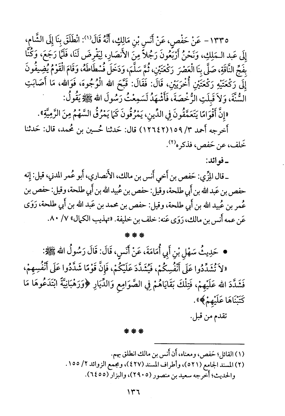 ١٣٣٥ - عن حفص، عن أَنس بن مالك، أنه قال (¬١): انطلق بنا إلى الشام، إلى عبد الملك، ونحن أربعون رجلا من الأنصار، ليفرض لنا، فلما رجع، وكنا بفج الناقة، صلى بنا العصر ركعتين، ثم سلم، ودخل فسطاطه، وقام القوم يضيفون إلى ركعتيه ركعتين أخريين، قال: فقال: قبح الله الوجوه، فوالله، ما أصابت السنة، ولا قبلت الرخصة، فأشهد لسمعت رسول الله صَلى الله عَليه وسَلم يقول: