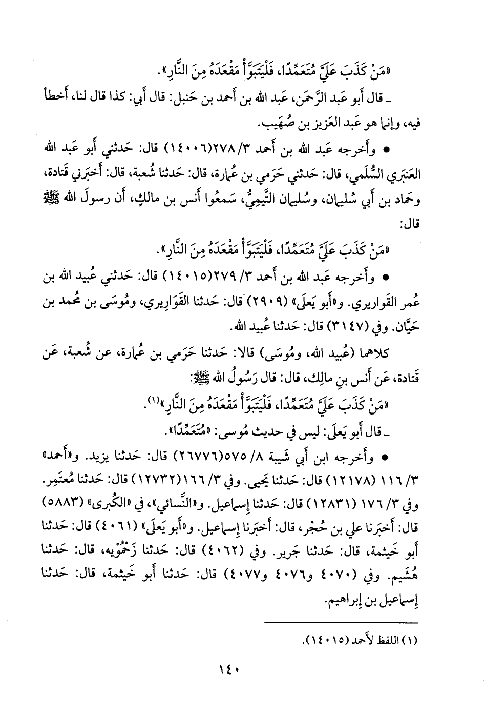 - قال أَبو يَعلى: ليس في حديث موسى: «متعمدا».