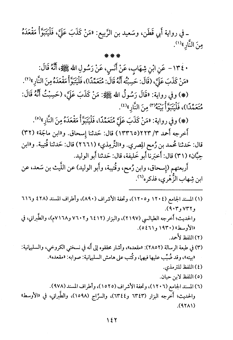 - وفي رواية: «من كذب علي متعمدا، فليتبوأ مقعده من النار» (¬٤).