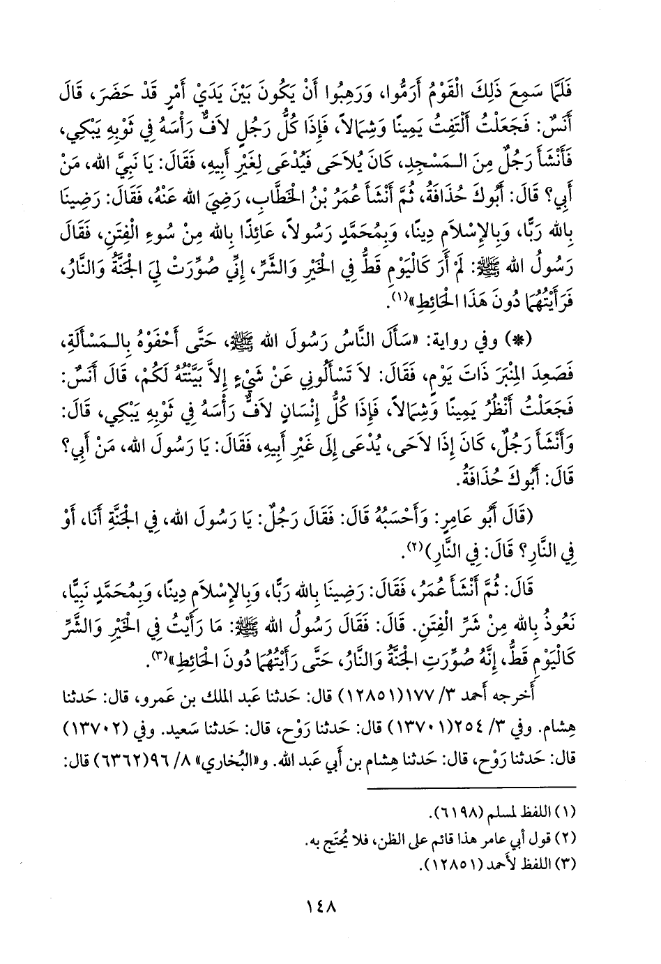 - وفي رواية: «سأل الناس رسول الله صَلى الله عَليه وسَلم حتى أحفوه بالمسألة، فصعد المنبر ذات يوم، فقال: لا تسألوني عن شيء إلا بينته لكم، قال أنس: فجعلت أنظر يمينا وشمالا، فإذا كل إنسان لاف رأسه في ثوبه يبكي، قال: وأنشأ رجل، كان إذا لاحى، يدعى إلى غير أبيه، فقال: يا رسول الله، من أبي؟ قال: أَبوك حذافة.