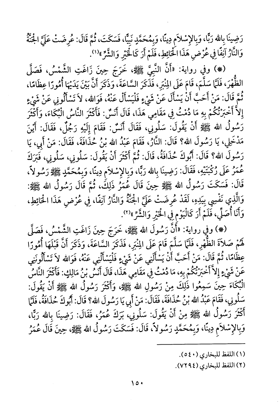 - وفي رواية: «أن رسول الله صَلى الله عَليه وسَلم خرج حين زاغت الشمس، فصلى لهم صلاة الظهر، فلما سلم قام على المنبر، فذكر الساعة، وذكر أن قبلها أمورا عظاما، ثم قال: من أحب أن يسألني عن شيء فليسألني عنه، فوالله لا تسألونني عن شيء إلا أخبرتكم به، ما دمت في مقامي هذا، قال أَنس بن مالك: فأكثر الناس البكاء حين سمعوا ذلك من رسول الله صَلى الله عَليه وسَلم وأكثر رسول الله صَلى الله عَليه وسَلم أن يقول: سلوني، فقام عبد الله بن حذافة، فقال: من أبي يا رسول الله؟ قال: أَبوك حذافة، فلما أكثر رسول الله صَلى الله عَليه وسَلم من أن يقول: سلوني، برك عمر، فقال: رضينا بالله ربا، وبالإسلام دينا، وبمحمد رسولا، قال: فسكت رسول الله صَلى الله عَليه وسَلم حين قال عمر