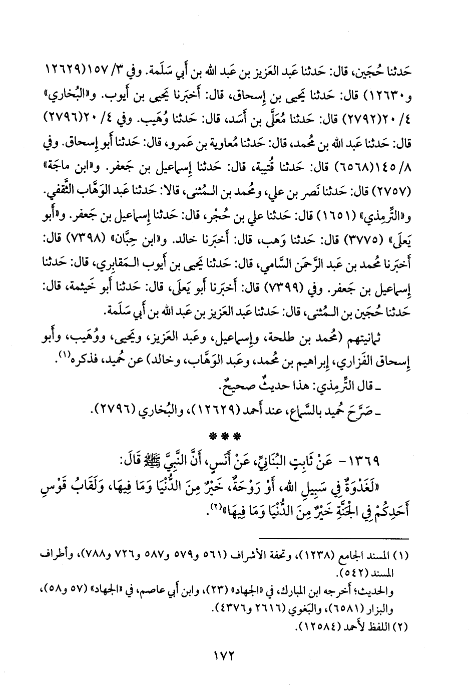 «لغدوة في سبيل الله، أو روحة، خير من الدنيا وما فيها، ولقاب قوس أحدكم في الجنة خير من الدنيا وما فيها» (¬١).