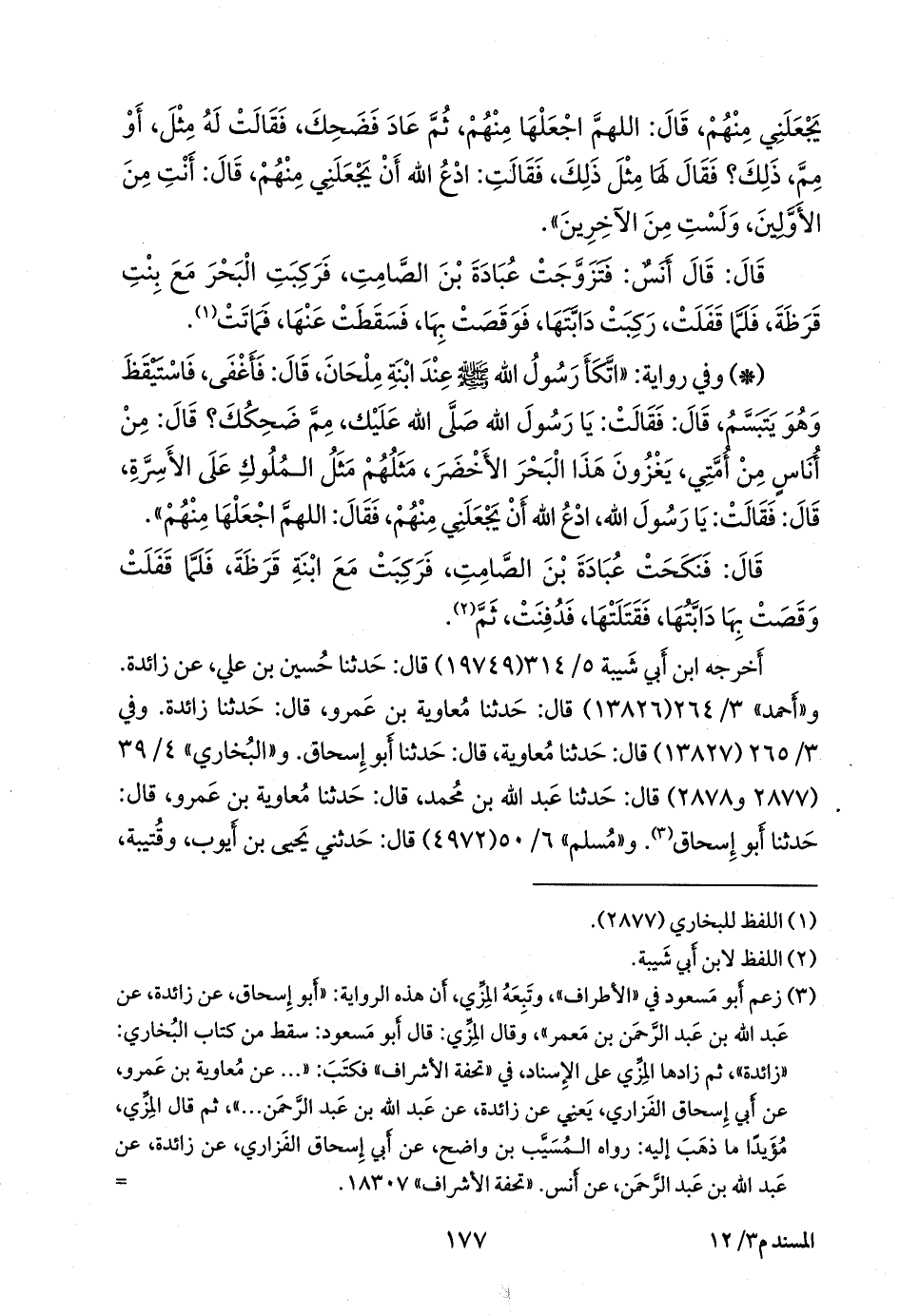 (¬١) زعم أَبو مسعود في «الأطراف»، وتبعه المزي، أن هذه الرواية: «أَبو إسحاق، عن زائدة، عن عبد الله بن عبد الرَّحمَن بن معمر»، وقال المِزِّي: قال أَبو مسعود: سقط من كتاب البخاري: «زائدة»، ثم زادها المِزِّي على الإسناد في «تحفة الأشراف» فكتب: «عن معاوية بن عَمرو، عن أبي إسحاق الفزاري، يعني عن زائدة، عن عبد الله بن عبد الرَّحمَن»، ثم قال المِزِّي، مؤيدا ما ذهب إليه: رواه المُسَيَّب بن واضح، عن أبي إسحاق الفزاري، عن زائدة، عن عبد الله بن عبد الرَّحمَن، عن أَنس. «تحفة الأشراف» ١٨٣٠٧، وتعقب ذلك ابن حجر، فأجاد وأفاد، قال: أقر المِزِّي هذا، وقواه برواية المُسَيب، وهو خطأ فإن الذي وقع في «صحيح البخاري» هو الصواب، ورواية المُسَيَّب بن واضح خطأ فقد أخرجه أحمد في «مسنده» (١٣٨٢٧) عن معاوية بن عَمرو، عن أبي إسحاق، بغير واسطة، لا «زائدة»، ولا غيره، ثم أخرجه أحمد (١٣٨٢٦) عن معاوية بن عَمرو، عن زائدة، عن أبي طُوَالة، وكذا أخرجه الإسماعيلي، عن أبي يَعلى (٣٦٧٦)، قال: حدثنا أَبو خيثمة، قال: حدثنا معاوية بن عَمرو، قال: حدثنا زائدة، وقد قال أَبو علي الجياني، متعقبا على أبي مسعود ما نصه: تتبعت طرق هذا الحديث، عن أبي إسحاق الفزاري، فلم أجد فيها «زائدة»، قال ابن حجر: وقد وقفت عليه، في كتاب «السير» لأبي إسحاق الفزاري، ليس فيه «زائدة»، وكذا أخرجه أَبو نُعيم في «المستخرج» قال: حدثنا ابن المُقرِئ، قال: حدثنا أَبو عَروبَة، قال: حدثنا المُسَيَّب بن واضح، عن أبي إسحاق، عن أبي طُوَالة، عن أَنس، ليس فيه زائدة. «النكت الظراف» ١٨٣٠٧، وانظر «فتح الباري» ٦/ ٧٧.