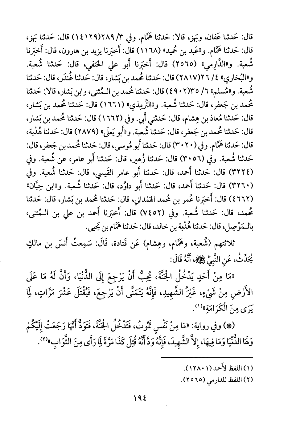 - وفي رواية: «ما من أحد من أهل الجنة، يسره أن يرجع إلى الدنيا، غير الشهيد، فإنه يحب أن يرجع إلى الدنيا، يقول: حتى أقتل عشر مرات في سبيل الله، مما يرى مما أعطاه الله من الكرامة» (¬٣).