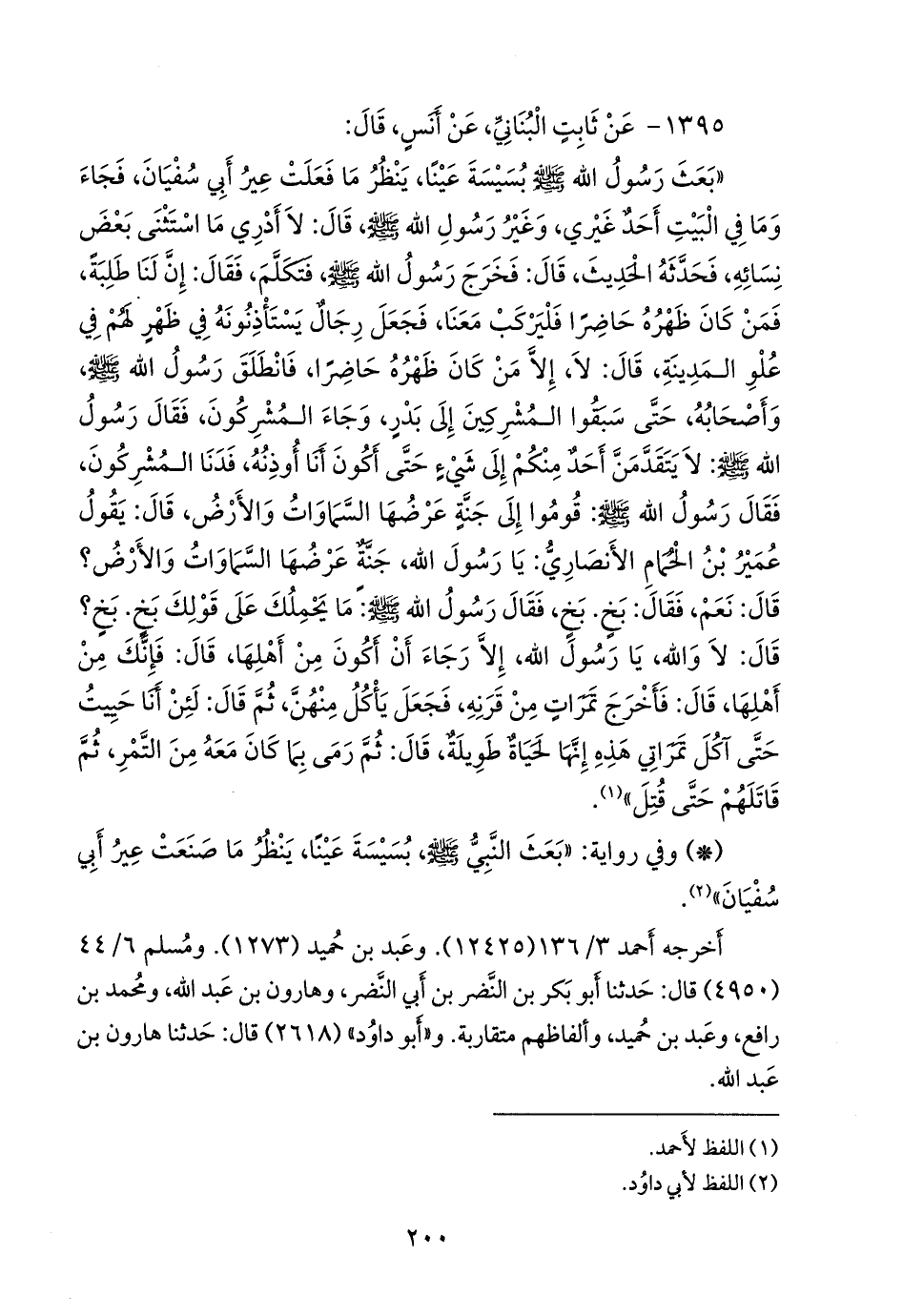 ـ رواية أبي داود مختصرة على: «بعث, يعني النبيَّ صَلى الله عَليه وسَلم بَسبَسةَ عينًا، ينظر ما صَنَعَت عِيرَ أبي سفيان».