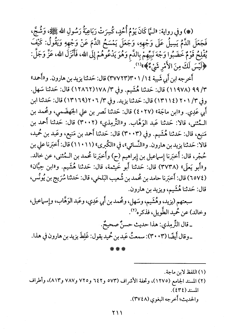 وفي ٣/ ٢٠٦ (١٣١٦٩) قال: حدثنا ابن أَبي عَدي. و «ابن ماجة» (٤٠٢٧) قال: حدثنا نصر بن علي الجهضمي، ومحمد بن المثنى، قالا: حدثنا عبد الوَهَّاب. و «التِّرمِذي» (٣٠٠٢) قال: حدثنا أحمد بن مَنيع، قال: حدثنا هُشيم. وفي (٣٠٠٣) قال: حدثنا أحمد بن مَنيع، وعَبد بن حُميد، قالا: حدثنا يزيد بن هارون. و «النَّسَائي» في «الكبرى» (١١٠١١) قال: أخبرنا علي بن حُجْر، قال: أخبرنا إسماعيل بن إبراهيم (ح) وأخبرنا محمد بن المثنى، عن خالد. و «أَبو يَعلى» (٣٧٣٨) قال: حدثنا أَبو خيثمة، قال: حدثنا هُشيم. و «ابن حِبَّان» (٦٥٧٤) قال: أخبرنا حامد بن محمد بن شعيب البلخي، قال: حدثنا سريج بن يونس، قال: حدثنا هُشيم، ويزيد بن هارون.