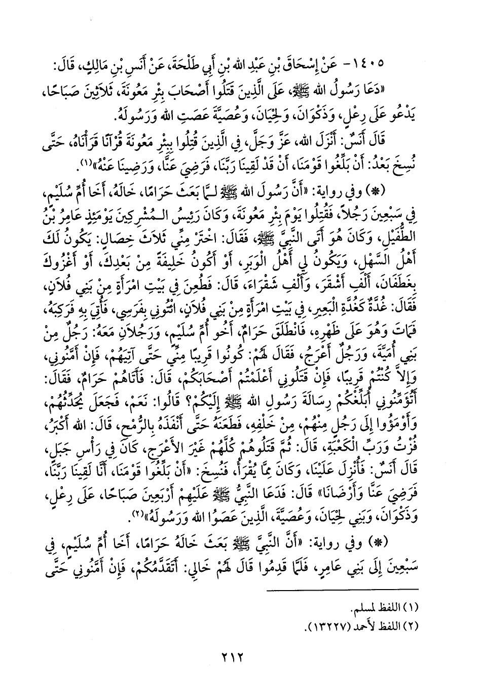 - وفي رواية: «أن رسول الله صَلى الله عَليه وسَلم لما بعث حراما، خاله، أخا أُم سُليم، في سبعين رجلا، فقتلوا يوم بئر معونة، وكان رئيس المشركين يومئذ عامر بن الطفيل، وكان هو أتى النبي صَلى الله عَليه وسَلم فقال: اختر مني ثلاث خصال: يكون لك أهل السهل، ويكون لي أهل الوبر، أو أكون خليفة من بعدك، أو أغزوك بغطفان، ألف أشقر، وألف شقراء، قال: فطعن في بيت امرأة من بني فلان، فقال: غدة كغدة البعير، في بيت امرأة من بني فلان، ائتوني بفرسي، فأتي به فركبه، فمات وهو على ظهره، فانطلق حرام، أخو أُم سُليم، ورجلان معه: رجل من بني أمية، ورجل أعرج، فقال لهم: كونوا قريبا مني حتى آتيهم، فإن أمنوني، وإلا كنتم قريبا، فإن قتلوني أعلمتم أصحابكم، قال: فأتاهم حرام، فقال: أتؤمنوني أبلغكم رسالة رسول الله صَلى الله عَليه وسَلم إليكم؟ قالوا: نعم، فجعل يحدثهم، وأومؤوا إلى رجل منهم، من خلفه، فطعنه حتى أنفذه بالرمح، قال: الله أكبر، فزت ورب الكعبة، قال: ثم قتلوهم كلهم غير الأعرج، كان في رأس جبل، قال أنس: فأنزل علينا، وكان مما يقرأ، فنسخ: «أن بلغوا قومنا، أنا لقينا ربنا، فرضي عنا وأرضانا» قال: فدعا النبي صَلى الله عَليه وسَلم عليهم أربعين صباحا، على رعل، وذكوان، وبني لحيان، وعصية، الذين عصوا الله ورسوله» (¬٢).