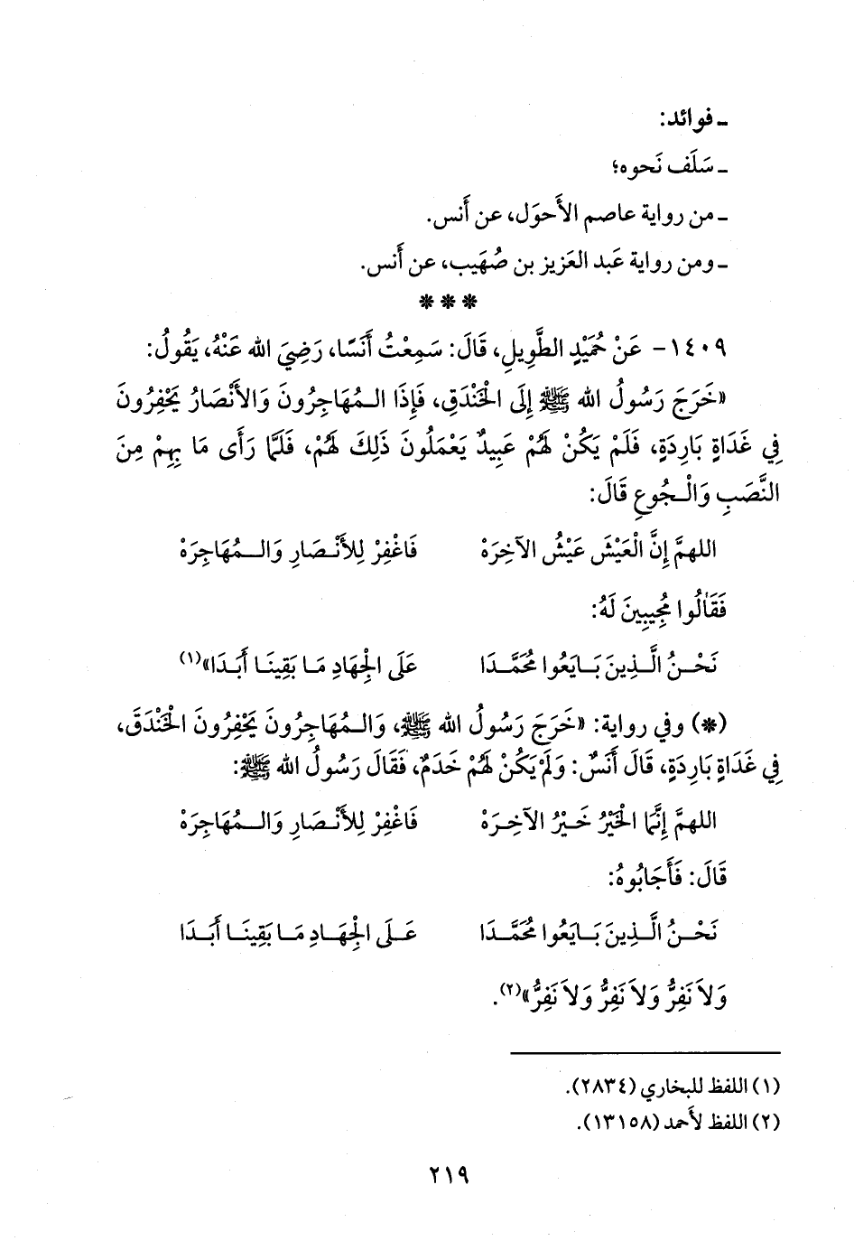 - وفي رواية: «خرج رسول الله صَلى الله عَليه وسَلم والمهاجرون يحفرون الخندق، في غداة باردة، قال أنس: ولم يكن لهم خدم، فقال رسول الله صَلى الله عَليه وسَلم: