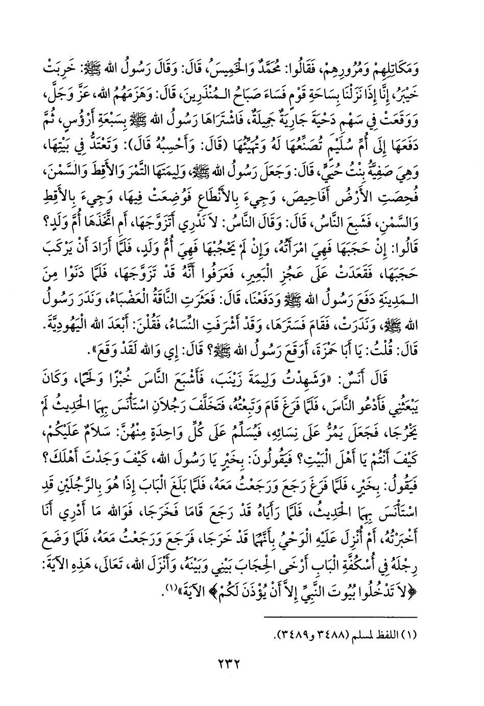 قال أنس: «وشهدت وليمة زينب، فأشبع الناس خبزا ولحما، وكان يبعثني فأدعو الناس، فلما فرغ قام وتبعته، فتخلف رجلان استأنس بهما الحديث لم يخرجا، فجعل يمر على نسائه، فيسلم على كل واحدة منهن: سلام عليكم، كيف أنتم يا أهل البيت؟ فيقولون: بخير يا رسول الله، كيف وجدت أهلك؟ فيقول: بخير، فلما فرغ رجع ورجعت معه، فلما بلغ الباب إذا هو بالرجلين قد استأنس بهما الحديث، فلما رأياه قد رجع قاما فخرجا، فوالله ما أدري أنا أخبرته، أم أنزل عليه الوحي بأنهما قد خرجا، فرجع ورجعت معه، فلما وضع رجله في أسكفة الباب أرخى الحجاب بيني وبينه، وأنزل الله، تعالى، هذه الآية: {لا تدخلوا بيوت النبي إلا أن يؤذن لكم} الآية» (¬١).