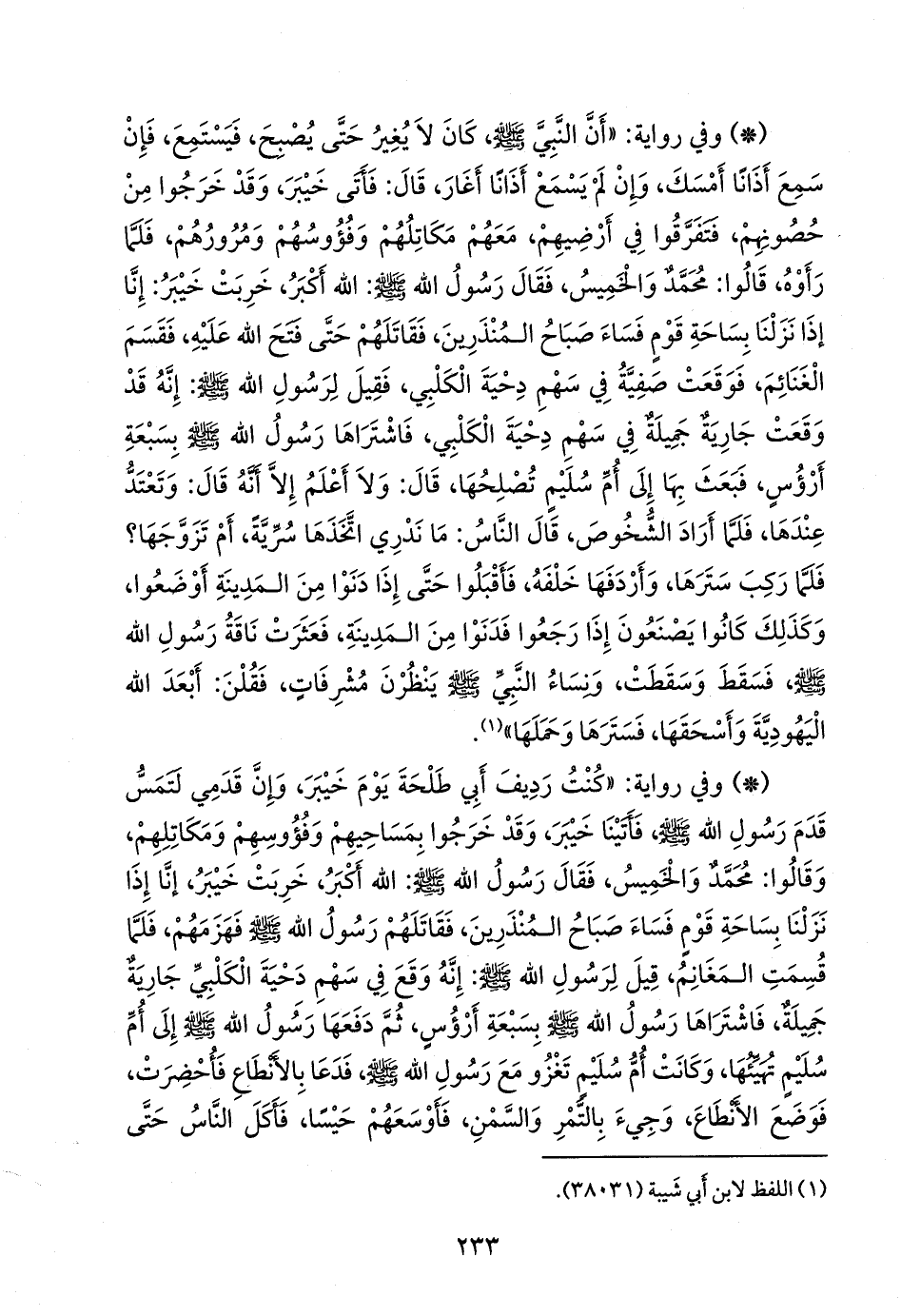 - وفي رواية: «كنت رديف أبي طلحة يوم خيبر، وإن قدمي لتمس قدم رسول الله صَلى الله عَليه وسَلم فأتينا خيبر، وقد خرجوا بمساحيهم وفؤوسهم ومكاتلهم، وقالوا: محمد والخميس، فقال رسول الله صَلى الله عَليه وسَلم: الله أكبر، خربت خيبر، إنا إذا نزلنا بساحة قوم فساء صباح المنذرين، فقاتلهم رسول الله صَلى الله عَليه وسَلم فهزمهم، فلما قسمت المغانم، قيل لرسول الله صَلى الله عَليه وسَلم: إنه وقع في سهم دحية الكلبي جارية جميلة، فاشتراها رسول الله صَلى الله عَليه وسَلم بسبعة أرؤس، ثم دفعها رسول الله صَلى الله عَليه وسَلم إلى أُم سُليم تهيئها، وكانت أُم سُليم تغزو مع رسول الله صَلى الله عَليه وسَلم فدعا بالأنطاع فأحضرت، فوضع الأنطاع، وجيء بالتمر والسمن، فأوسعهم حيسا، فأكل الناس حتى