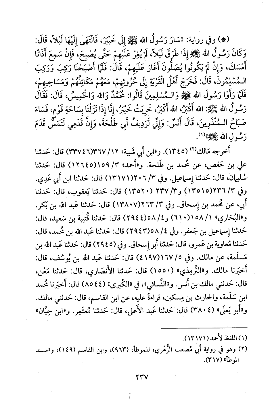 وفي ٣/ ٢٠٦ (١٣١٧١) قال: حدثنا ابن أَبي عَدي. وفي ٣/ ٢٣٦ (١٣٥١٥) و ٣/ ٢٣٧ (١٣٥٢٠) قال: حدثنا يعقوب، قال: حدثنا أبي، عن محمد بن إسحاق. وفي ٣/ ٢٦٣ (١٣٨٠٧) قال: حدثنا عبد الله بن بكر. و «البخاري» ١/ ١٢٥ (٦١٠) و ٤/ ٤٨ (٢٩٤٤) قال: حدثنا قتيبة بن سعيد، قال: حدثنا إسماعيل بن جعفر. وفي ٤/ ٤٧ (٢٩٤٣) قال: حدثنا عبد الله بن محمد، قال: حدثنا معاوية بن عَمرو، قال: حدثنا أَبو إسحاق. وفي (٢٩٤٥) قال: حدثنا عبد الله بن مَسلَمة، عن مالك. وفي ٥/ ١٣١ (٤١٩٧) قال: حدثنا عبد الله بن يوسف، قال: أخبرنا مالك. و «التِّرمِذي» (١٥٥٠) قال: حدثنا الأَنصاري، قال: حدثنا مَعْن، قال: حدثني مالك بن أنس. و «النَّسَائي» في «الكبرى» (٨٥٤٤) قال: أخبرنا محمد بن سلمة، والحارث بن مسكين، قراءة عليه، عن ابن القاسم، قال: حدثني مالك. و «أَبو يَعلى» (٣٨٠٤) قال: حدثنا عبد الأعلى، قال: حدثنا معتمر. و «ابن حِبَّان»