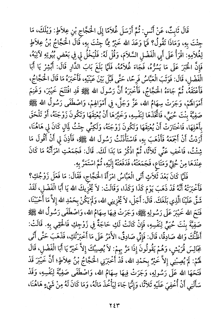 قال ثابت، عن أَنس: ثم أرسل غلاما إلى الحجاج بن علاط: ويلك، ما جئت به، وماذا تقول؟ فما وعد الله خير مما جئت به، قال الحجاج بن علاط لغلامه: اقرأ على أبي الفضل السلام، وقل له: فليخل لي في بعض بيوته لآتيه، فإن الخبر على ما يسره، فجاء غلامه، فلما بلغ باب الدار قال: أبشر يا أبا الفضل، قال: فوثب العباس فرحا، حتى قبل بين عينيه، فأخبره ما قال الحجاج، فأعتقه، ثم جاءه الحجاج، فأخبره أن رسول الله صَلى الله عَليه وسَلم قد افتتح خيبر، وغنم أموالهم، وجرت سهام الله، عز وجل، في أموالهم، واصطفى رسول الله صَلى الله عَليه وسَلم صفية بنت حيي، فاتخذها لنفسه، وخيرها أن يعتقها وتكون زوجته، أو تلحق بأهلها، فاختارت أن يعتقها وتكون زوجته، ولكني جئت لمال كان لي هاهنا، أردت أن أجمعه فأذهب به، فاستأذنت رسول الله صَلى الله عَليه وسَلم فأذن لي أن أقول ما شئت، فأَخف عني ثلاثا، ثم اذكر ما بدا لك. قال: فجمعت امرأته ما كان عندها من حلي ومتاع، فجمعته، فدفعته إليه، ثم استمر به.