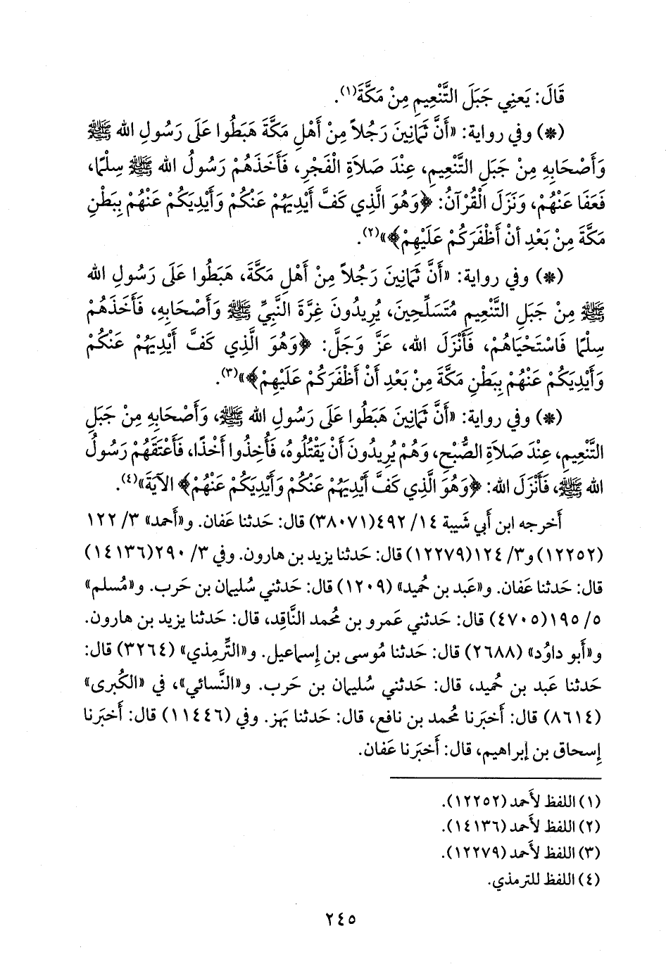 - وفي رواية: «أن ثمانين هبطوا على رسول الله صَلى الله عَليه وسَلم وأصحابه من جبل التنعيم، عند صلاة الصبح، وهم يريدون أن يقتلوه، فأخذوا أخذا، فأعتقهم رسول الله صَلى الله عَليه وسَلم فأنزل الله: {وهو الذي كف أيديهم عنكم وأيديكم عنهم} الآية» (¬١).