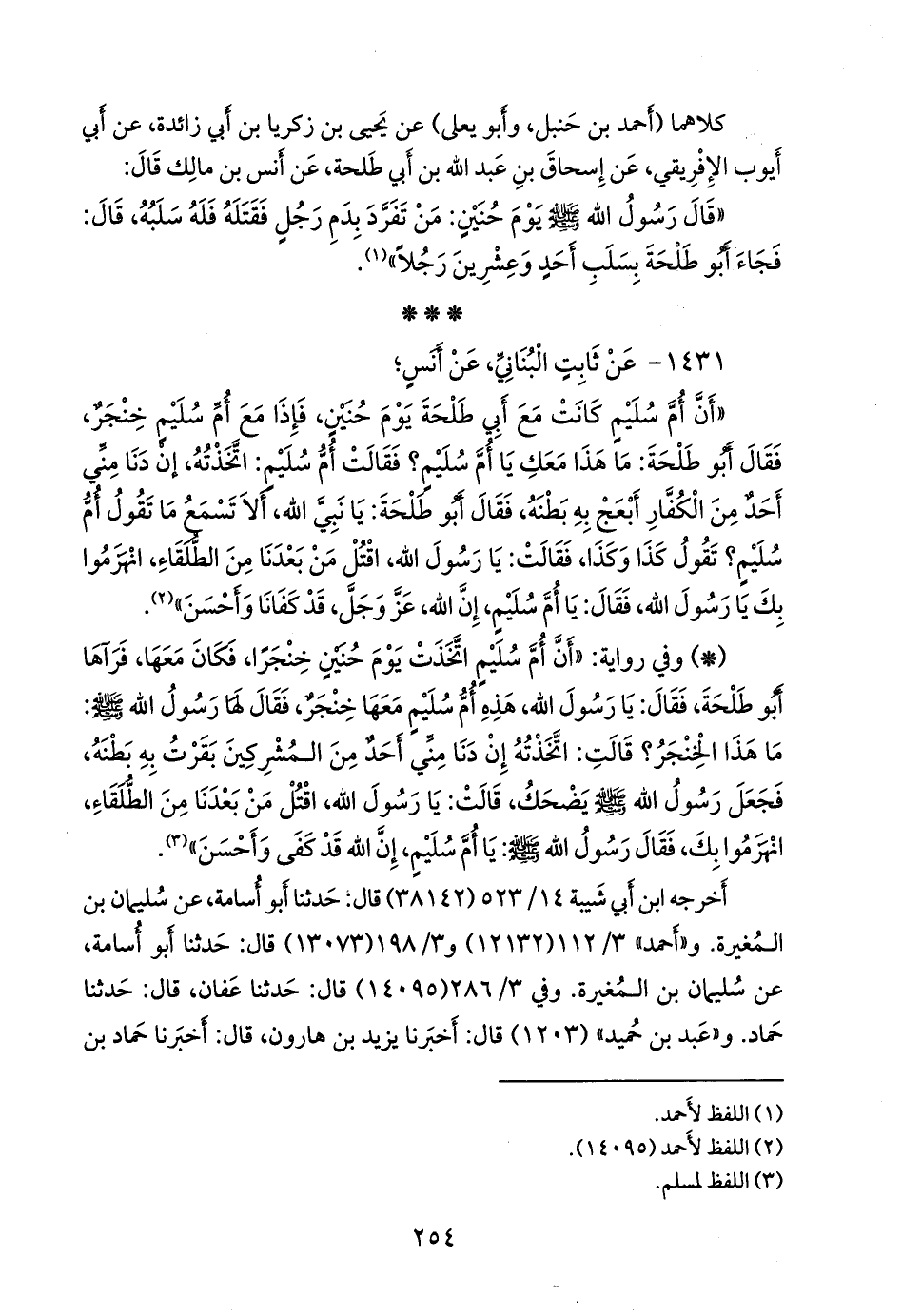 «أن أُم سُليم كانت مع أبي طلحة يوم حنين، فإذا مع أُم سُليم خنجر، فقال أَبو طلحة: ما هذا معك يا أُم سُليم؟ فقالت أُم سُليم: اتخذته، إن دنا مني أحد من الكفار أبعج به بطنه، فقال أَبو طلحة: يا نبي الله، ألا تسمع ما تقول أُم سُليم؟ تقول كذا وكذا، فقالت: يا رسول الله، اقتل من بعدنا من الطلقاء، انهزموا بك يا رسول الله، فقال: يا أُم سُليم، إن الله، عز وجل، قد كفانا وأحسن» (¬١).