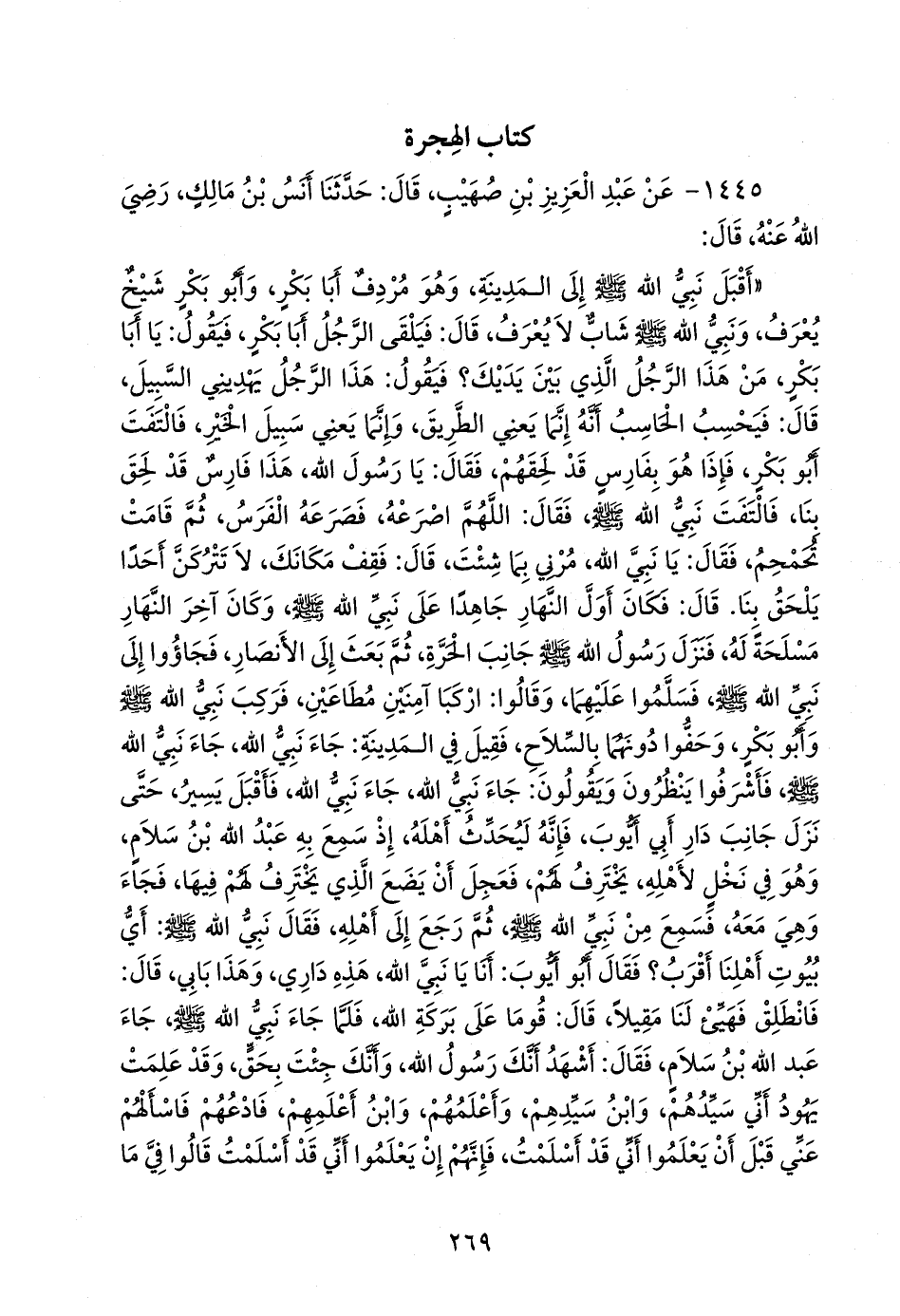 «أقبل نبي الله صَلى الله عَليه وسَلم إلى المدينة، وهو مردف أبا بكر، وأَبو بكر شيخ يعرف، ونبي الله صَلى الله عَليه وسَلم شاب لا يعرف، قال: فيلقى الرجل أبا بكر، فيقول: يا أبا بكر، من هذا الرجل الذي بين يديك؟ فيقول: هذا الرجل يهديني السبيل، قال: فيحسب الحاسب أنه إنما يعني الطريق، وإنما يعني سبيل الخير، فالتفت أَبو بكر، فإذا هو بفارس قد لحقهم، فقال: يا رسول الله، هذا فارس قد لحق بنا، فالتفت نبي الله صَلى الله عَليه وسَلم فقال: اللهم اصرعه، فصرعه الفرس، ثم قامت تحمحم، فقال: يا نبي الله، مرني بما شئت، قال: فقف مكانك، لا تتركن أحدا يلحق بنا. قال: فكان أول النهار جاهدا على نبي الله صَلى الله عَليه وسَلم وكان آخر النهار مسلحة له، فنزل رسول الله صَلى الله عَليه وسَلم جانب الحرة، ثم بعث إلى الأنصار، فجاؤوا إلى نبي الله صَلى الله عَليه وسَلم فسلموا عليهما، وقالوا: اركبا آمنين مطاعين، فركب نبي الله صَلى الله عَليه وسَلم وأَبو بكر، وحفوا دونهما بالسلاح، فقيل في المدينة: جاء نبي الله، جاء نبي الله صَلى الله عَليه وسَلم فأشرفوا ينظرون ويقولون: جاء نبي الله، جاء نبي الله، فأقبل يسير، حتى نزل جانب دار أَبي أَيوب، فإنه ليحدث أهله، إذ سمع به عبد الله بن سلام، وهو في نخل لأهله، يخترف لهم، فعجل أن يضع الذي يخترف لهم فيها، فجاء وهي معه، فسمع من نبي الله صَلى الله عَليه وسَلم ثم رجع إلى أهله، فقال نبي الله صَلى الله عَليه وسَلم: أي بيوت أهلنا أقرب؟ فقال أَبو أيوب: أنا يا نبي الله، هذه داري، وهذا بابي، قال: فانطلق فهيئ لنا مقيلا، قال: قوما على بركة الله، فلما جاء نبي الله صَلى الله عَليه وسَلم جاء عبد الله بن سلام،