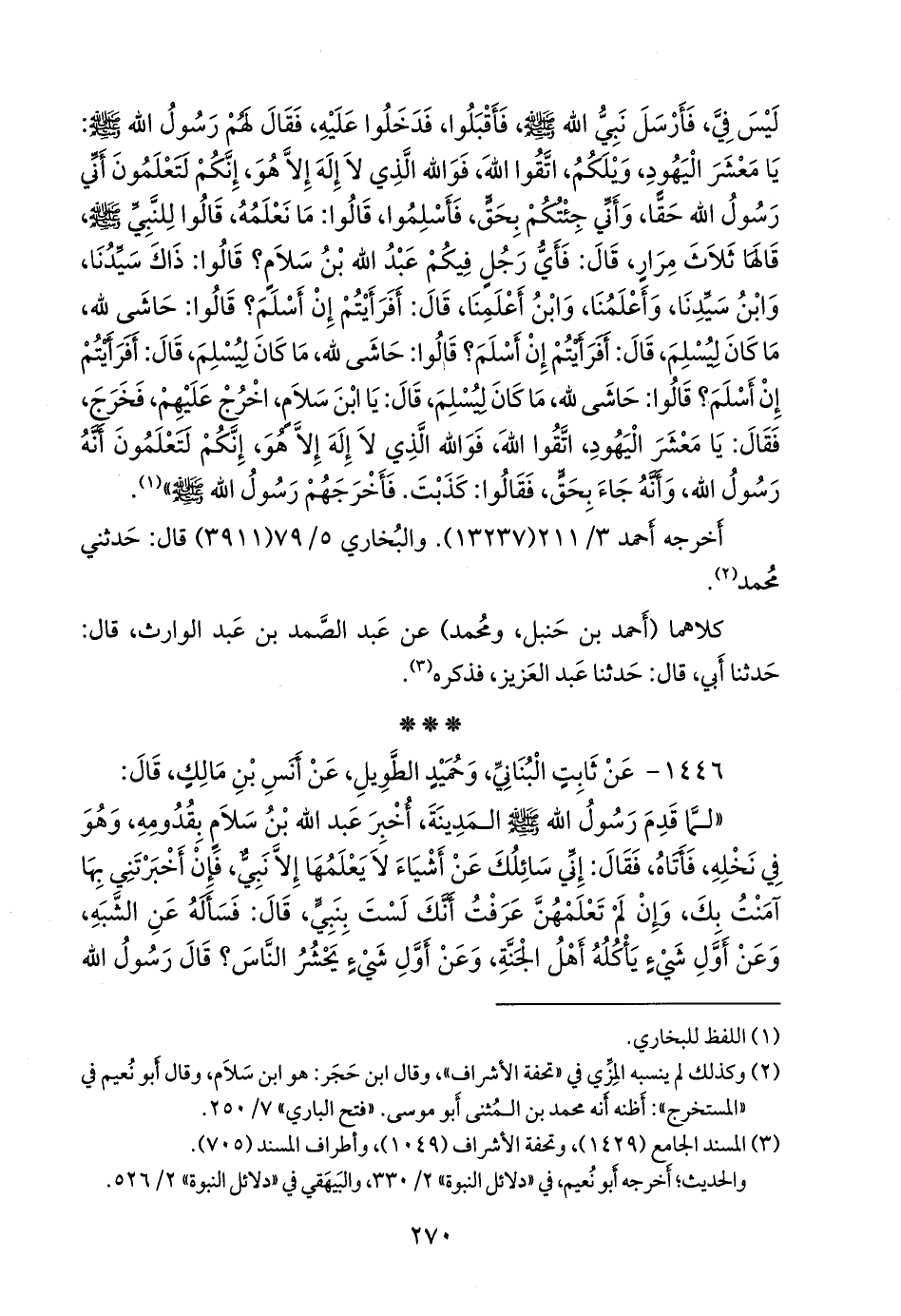 «لما قدم رسول الله صَلى الله عَليه وسَلم المدينة، أخبر عبد الله بن سلام بقدومه، وهو في نخله، فأتاه، فقال: إني سائلك عن أشياء لا يعلمها إلا نبي، فإن أخبرتني بها آمنت بك، وإن لم تعلمهن عرفت أنك لست بنبي، قال: فسأله عن الشبه، وعن أول شيء يأكله أهل الجنة، وعن أول شيء يحشر الناس؟ قال رسول الله