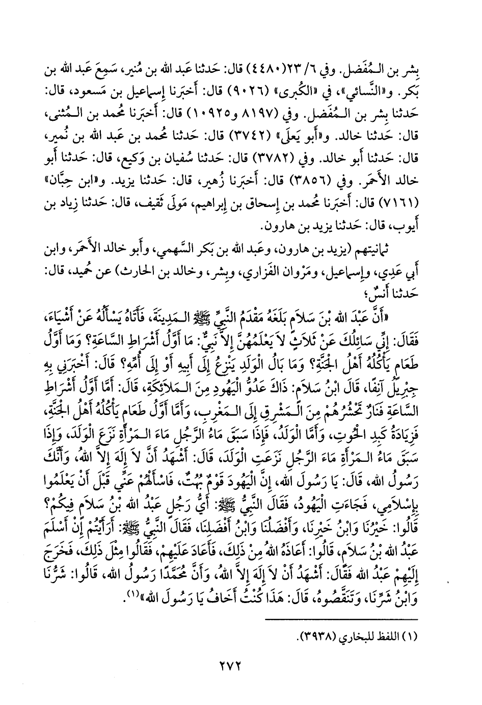 «أن عبد الله بن سلام بلغه مقدم النبي صَلى الله عَليه وسَلم المدينة، فأتاه يسأله عن أشياء، فقال: إني سائلك عن ثلاث لا يعلمهن إلا نبي: ما أول أشراط الساعة؟ وما أول طعام يأكله أهل الجنة؟ وما بال الولد ينزع إلى أبيه أو إلى أمه؟ قال: أخبرني به جبريل آنفا، قال ابن سلام: ذاك عدو اليهود من الملائكة، قال: أما أول أشراط الساعة فنار تحشرهم من المشرق إلى المغرب، وأما أول طعام يأكله أهل الجنة، فزيادة كبد الحوت، وأما الولد، فإذا سبق ماء الرجل ماء المرأة نزع الولد، وإذا سبق ماء المرأة ماء الرجل نزعت الولد، قال: أشهد أن لا إله إلا الله، وأنك رسول الله، قال: يا رسول الله، إن اليهود قوم بهت، فاسألهم عني قبل أن يعلموا بإسلامي، فجاءت اليهود، فقال النبي صَلى الله عَليه وسَلم: أي رجل عبد الله بن سلام فيكم؟ قالوا: خيرنا وابن خيرنا، وأفضلنا وابن أفضلنا، فقال النبي صَلى الله عَليه وسَلم: أرأيتم إن أسلم عبد الله بن سلام، قالوا: أعاذه الله من ذلك، فأعاد عليهم، فقالوا مثل ذلك، فخرج إليهم عبد الله فقال: أشهد أن لا إله إلا الله، وأن محمدا رسول الله، قالوا: شرنا وابن شرنا، وتنقصوه، قال: هذا كنت أخاف يا رسول الله» (¬١).
