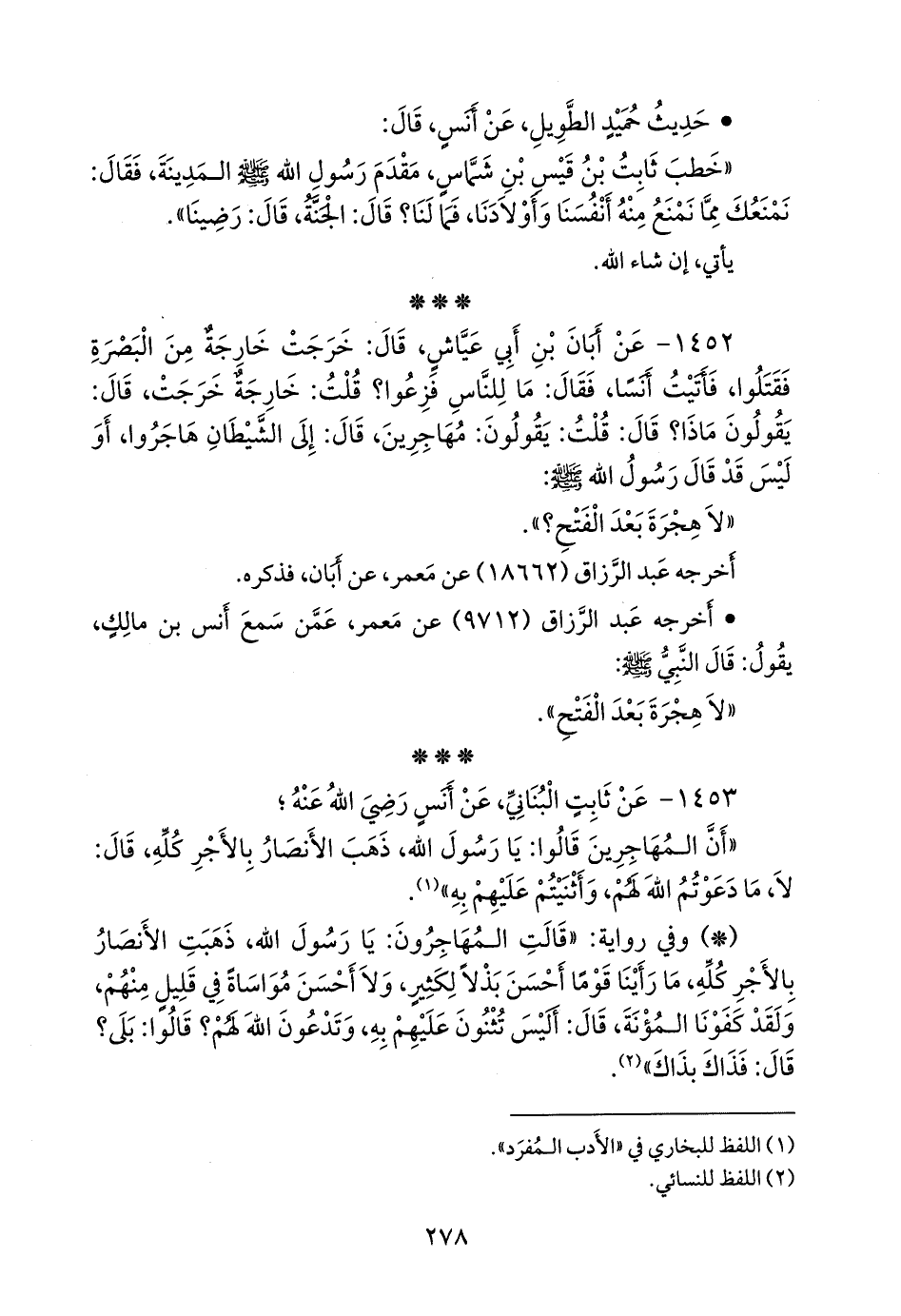 ١٤٥٢ - عن أَبَان بن أبي عياش، قال: خرجت خارجة من البصرة فقتلوا، فأتيت أَنسًا، فقال: ما للناس فزعوا؟ قلت: خارجة خرجت، قال: يقولون ماذا؟ قال: قلت: يقولون: مهاجرين، قال: إلى الشيطان هاجروا، أو ليس قد قال رسول الله صَلى الله عَليه وسَلم: