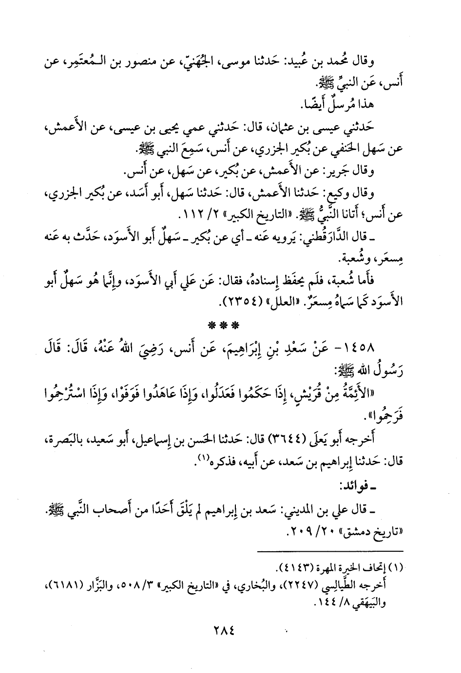 - وقال أَبو داود سليمان بن الأشعث: سمعت أبا عبد الله، يعني أحمد بن حنبل، سُئِل عن حديث إبراهيم بن سعد، عن أبيه، عن أَنس، عن النبي صَلى الله عَليه وسَلم؛ «الأئمة من قريش»، قال: ليس هذا في كتب إبراهيم، لا ينبغي أن يكون له أصل. «المنتخب من كتاب العلل للخلال» (٨٠)، و «الكامل» ١/ ٣٩٩.