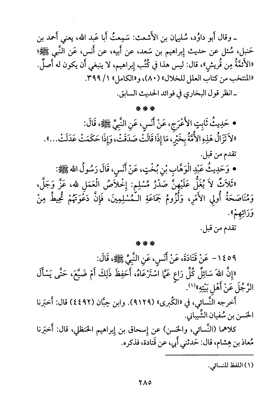 - قال أَبو عبد الرَّحمَن النَّسَائي: لم يرو هذا أحد علمناه، عن معاذ بن هشام، غير إسحاق بن إبراهيم بن رَاهَوَيْه.