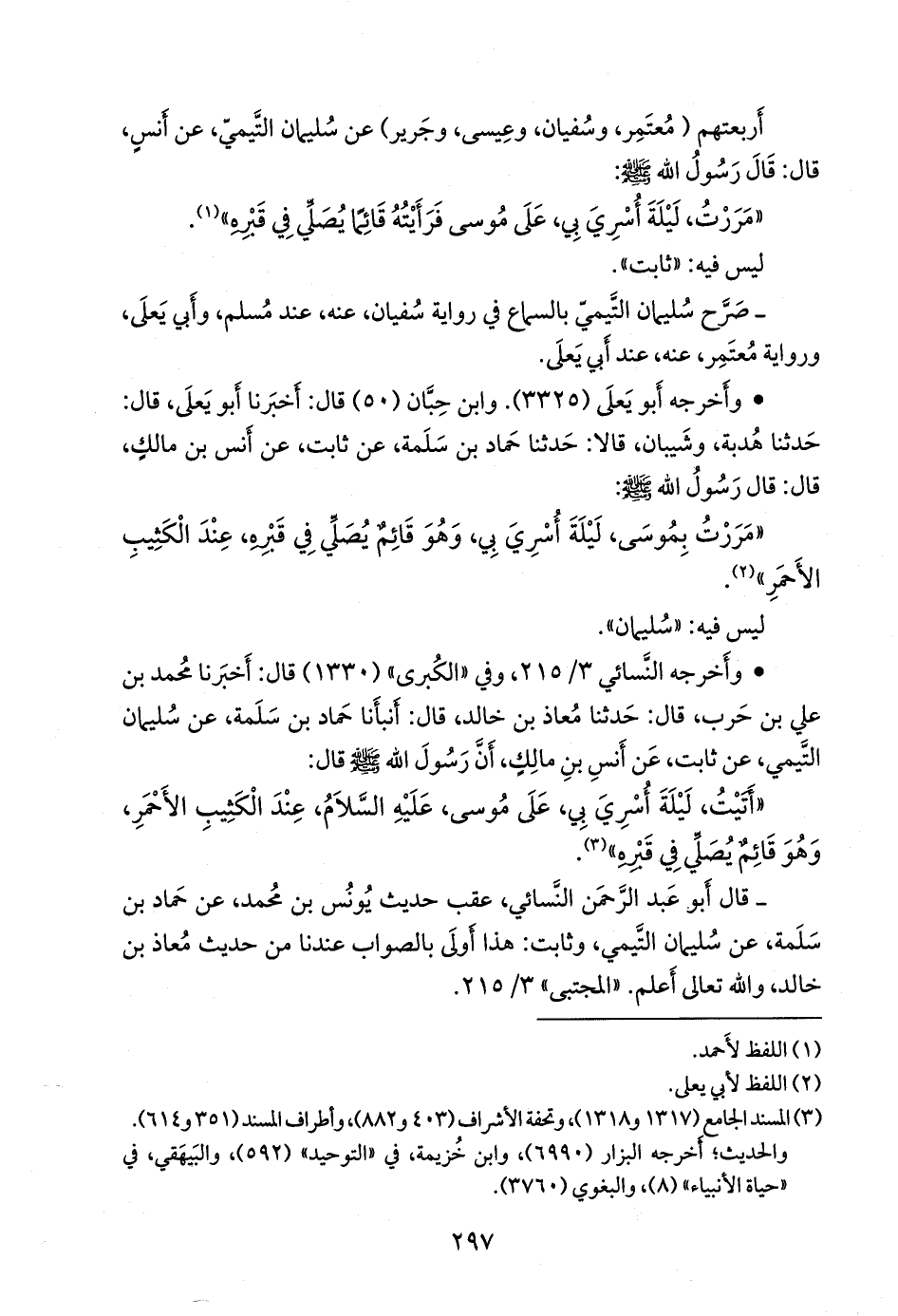 - وفي رواية: «عن أَنس بن مالك، عن بعض أصحابه، عن النبي صَلى الله عَليه وسَلم؛ أنه مر على موسى، ليلة أسري به، قائمًا يصلي في قبره».