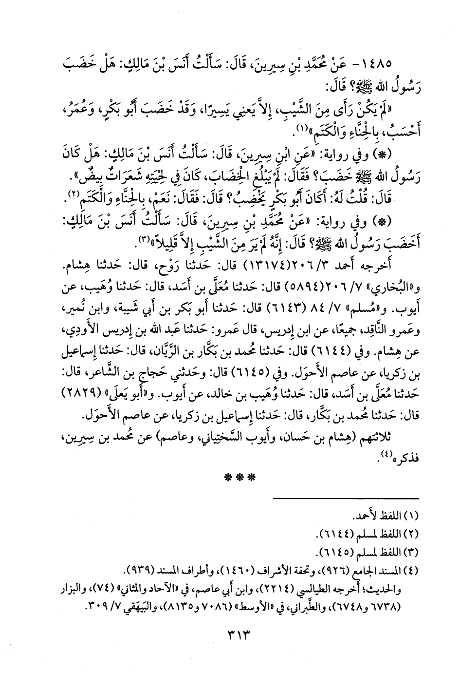 ١٤٨٥ - عن محمد بن سِيرين، قال: سألت أَنس بن مالك: هل خضب رسول الله صَلى الله عَليه وسَلم؟ قال: