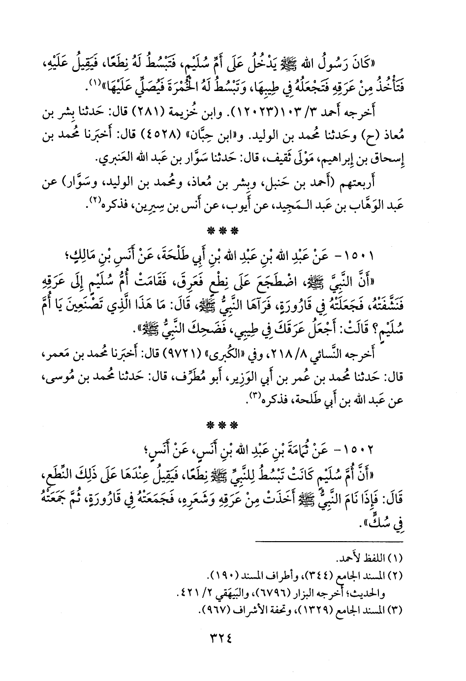 «أن أُم سُليم كانت تبسط للنبي صَلى الله عَليه وسَلم نطعا، فيقيل عندها على ذلك النطع، قال: فإذا نام النبي صَلى الله عَليه وسَلم أخذت من عرقه وشعره، فجمعته في قارورة، ثم جمعته في سك».