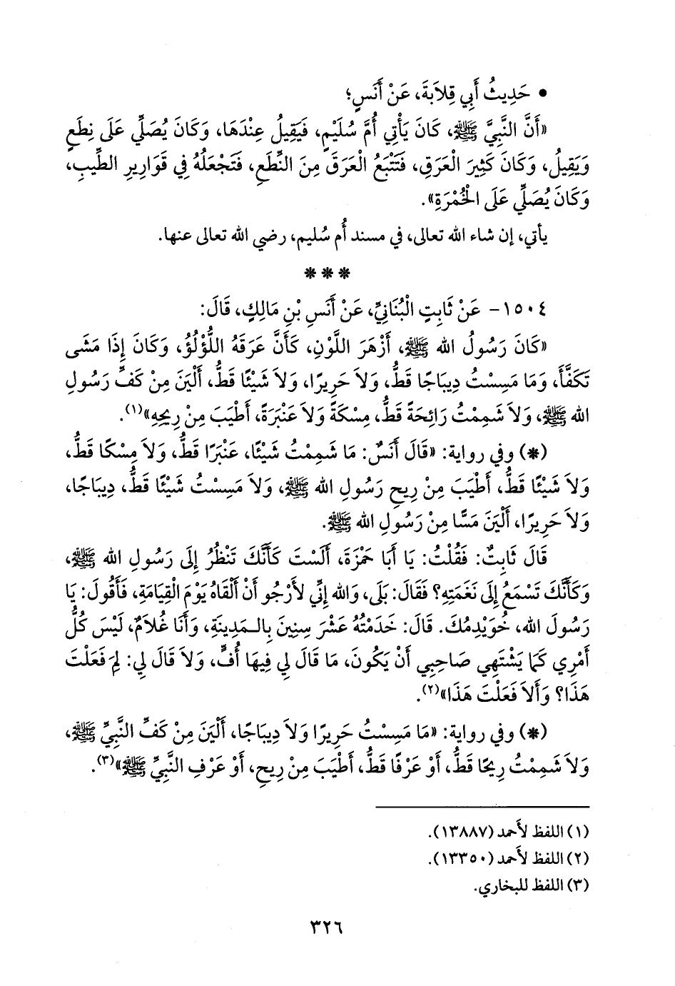- وفي رواية: «قال أنس: ما شممت شيئا، عنبرا قط، ولا مسكا قط، ولا شيئًا قط، أطيب من ريح رسول الله صَلى الله عَليه وسَلم ولا مسست شيئًا قط، ديباجا، ولا حريرا، ألين مسا من رسول الله صَلى الله عَليه وسَلم.
