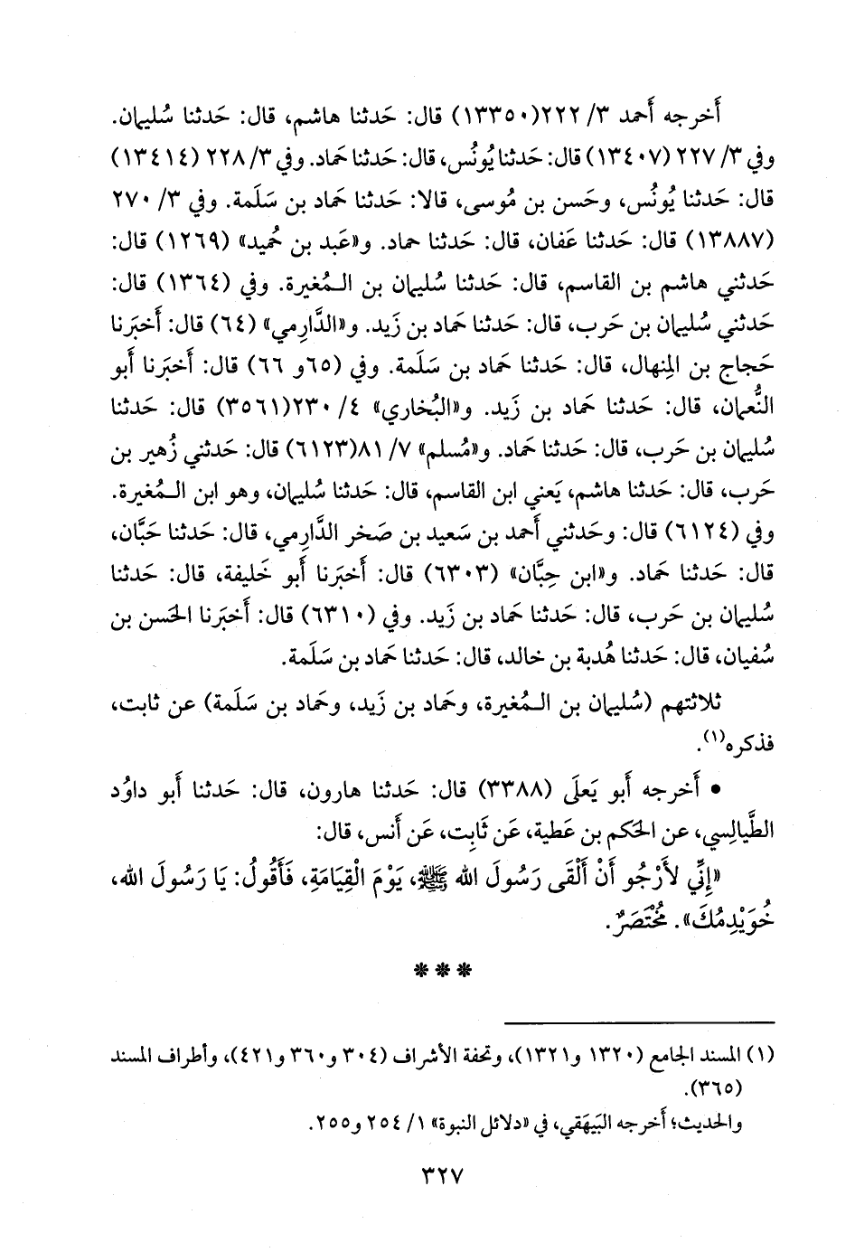 أخرجه أحمد (١٣٣٥٠) قال: حدثنا هاشم، قال: حدثنا سليمان. وفي ٣/ ٢٢٧ (١٣٤٠٧) قال: حدثنا يونس، قال: حدثنا حماد. وفي ٣/ ٢٢٨ (١٣٤١٤) قال: حدثنا يونس، وحسن بن موسى، قالا: حدثنا حماد بن سلمة. وفي ٣/ ٢٧٠ (١٣٨٨٧) قال: حدثنا عفان، قال: حدثنا حماد. و «عَبد بن حُميد» (١٢٦٩) قال: حدثني هاشم بن القاسم، قال: حدثنا سليمان بن المغيرة. وفي (١٣٦٤) قال: حدثني سليمان بن حرب، قال: حدثنا حماد بن زيد. و «الدَّارِمي» (٦٤) قال: أخبرنا حجاج بن المنهال، قال: حدثنا حماد بن سلمة. وفي (٦٥ و ٦٦) قال: أخبرنا أَبو النعمان، قال: حدثنا حماد بن زيد. و «البخاري» ٤/ ١٨٩ (٣٥٦١) قال: حدثنا سليمان بن حرب، قال: حدثنا حماد. و «مسلم» ٧/ ٨١ (٦١٢٣) قال: حدثني زهير بن حرب، قال: حدثنا هاشم، يعني ابن القاسم، قال: حدثنا سليمان، وهو ابن المغيرة. وفي (٦١٢٤) قال: وحدثني أحمد بن سعيد بن صخر الدَّارِمي، قال: حدثنا حبان، قال: حدثنا حماد. و «ابن حِبَّان» (٦٣٠٣) قال: أخبرنا أَبو خليفة، قال: حدثنا سليمان بن حرب، قال: حدثنا حماد بن زيد. وفي (٦٣١٠) قال: أخبرنا الحسن بن سفيان، قال: حدثنا هُدبة بن خالد، قال: حدثنا حماد بن سلمة.
