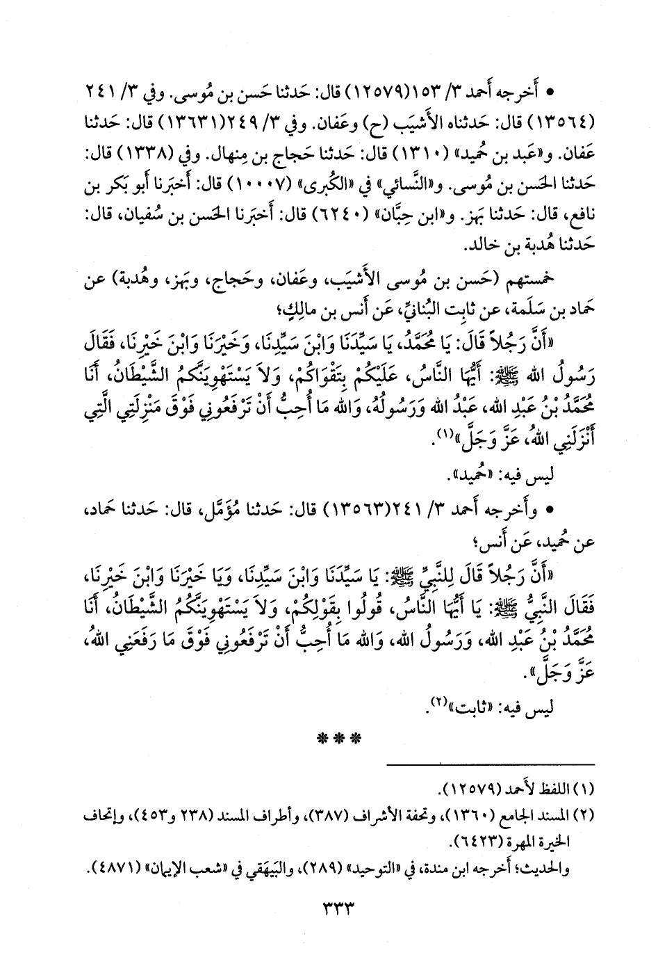«أن رجلا قال للنبي صَلى الله عَليه وسَلم: يا سيدنا وابن سيدنا، ويا خيرنا وابن خيرنا، فقال النبي صَلى الله عَليه وسَلم: يا أيها الناس، قولوا بقولكم، ولا يستهوينكم الشيطان، أنا محمد بن عبد الله، ورسول الله، والله ما أحب أن ترفعوني فوق ما رفعني الله، عز وجل».