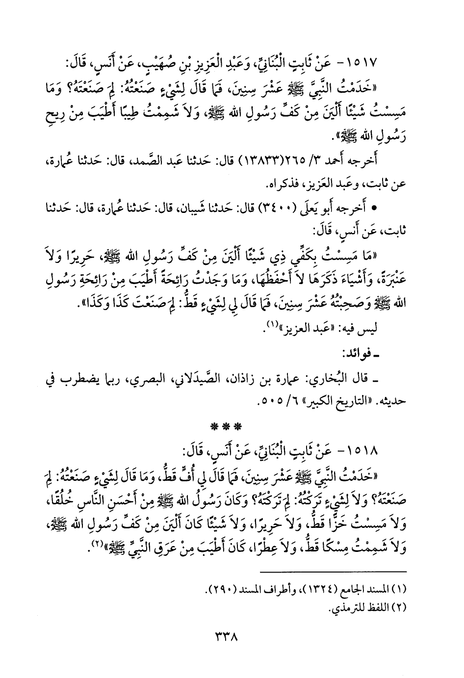 «ما مسست بكفي ذي شيئًا ألين من كف رسول الله صَلى الله عَليه وسَلم حريرا ولا عنبرة، وأشياء ذكرها لا أحفظها، وما وجدت رائحة أطيب من رائحة رسول الله صَلى الله عَليه وسَلم وصحبته عشر سنين، فما قال لي لشيء قط: لم صنعت كذا وكذا».