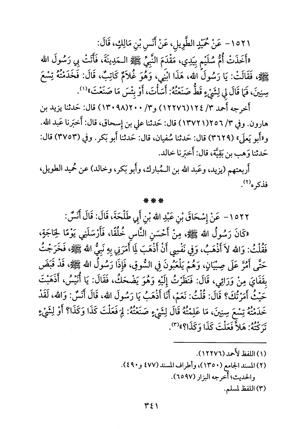 «أخذت أُم سُليم بيدي، مقدم النبي صَلى الله عَليه وسَلم المدينة، فأتت بي رسول الله صَلى الله عَليه وسَلم فقالت: يا رسول الله، هذا ابني، وهو غلام كاتب، قال: فخدمته تسع سنين، فما قال لي لشيء قط صنعته: أسأت، أو بئس ما صنعت» (¬١).