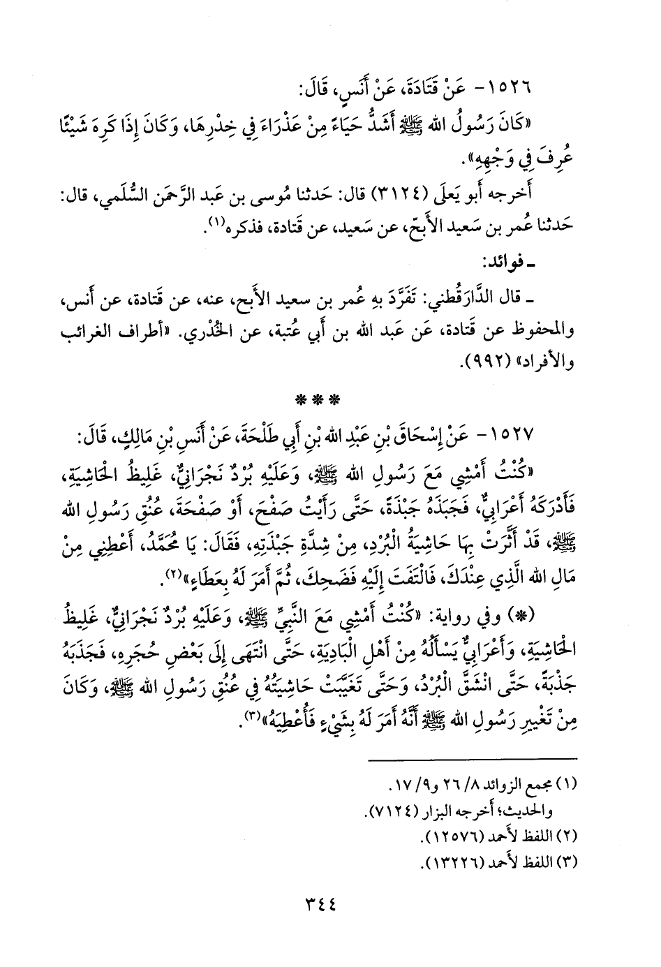 - وفي رواية: «كنت أمشي مع النبي صَلى الله عَليه وسَلم وعليه برد نجراني، غليظ الحاشية، وأعرابي يسأله من أهل البادية، حتى انتهى إلى بعض حجره، فجذبه جذبة، حتى انشق البرد، وحتى تغيبت حاشيته في عنق رسول الله صَلى الله عَليه وسَلم وكان من تغيير رسول الله صَلى الله عَليه وسَلم أنه أمر له بشيء فأعطيه» (¬٢).
