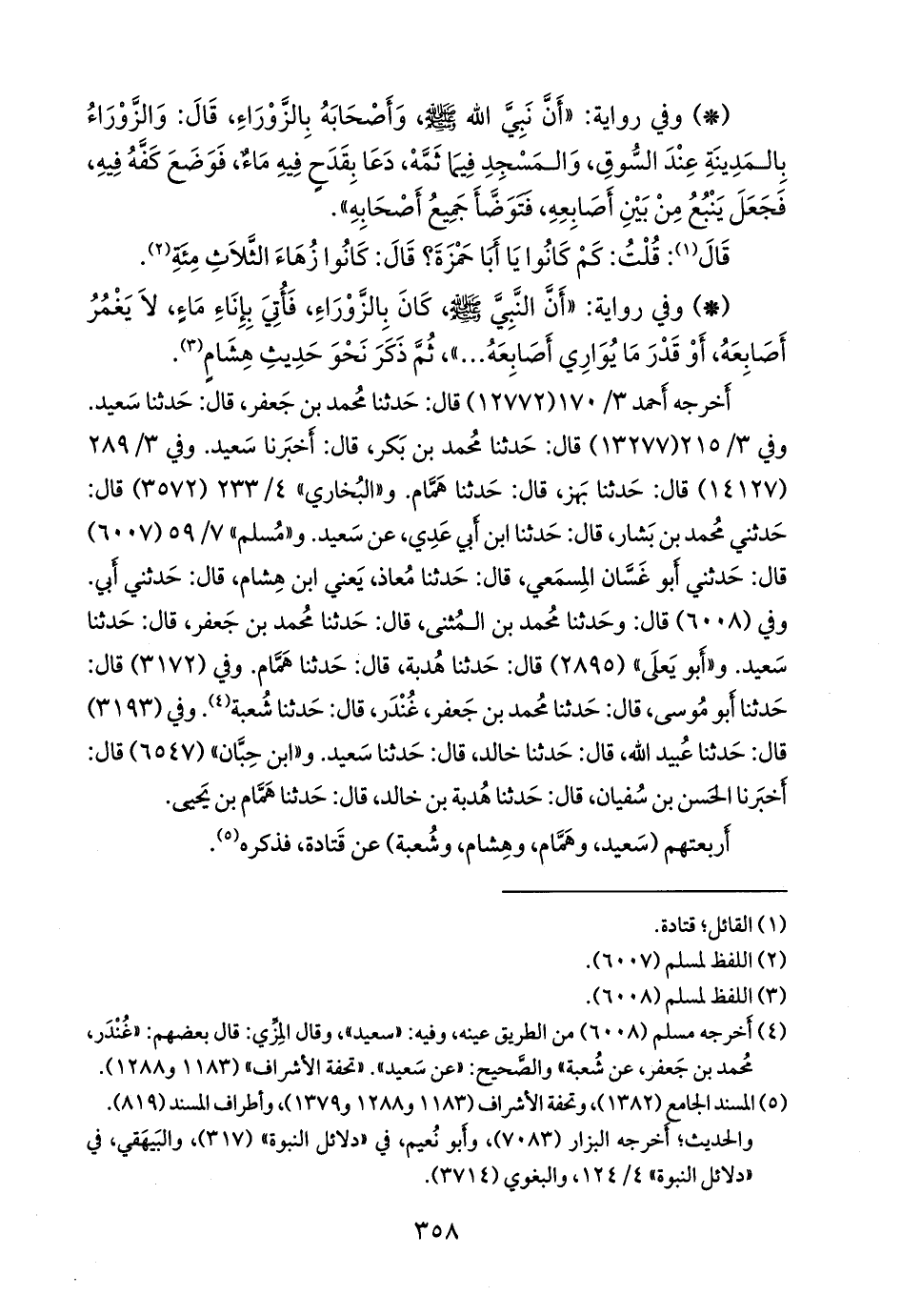 وفي ٣/ ٢٨٩ (١٤١٢٧) قال: حدثنا بَهز، قال: حدثنا همام. و «البخاري» ٤/ ١٩٢ (٣٥٧٢) قال: حدثني محمد بن بشار، قال: حدثنا ابن أَبي عَدي، عن سعيد. و «مسلم» ٧/ ٥٩ (٦٠٠٧) قال: حدثني أَبو غسان المسمعي، قال: حدثنا معاذ، يعني ابن هشام، قال: حدثني أبي. وفي (٦٠٠٨) قال: وحدثنا محمد بن المثنى، قال: حدثنا محمد بن جعفر، قال: حدثنا سعيد. و «أَبو يَعلى» (٢٨٩٥) قال: حدثنا هُدبة، قال: حدثنا همام. وفي (٣١٧٢) قال: حدثنا أَبو موسى، قال: حدثنا محمد بن جعفر غُندَر، قال: حدثنا شعبة (¬١). وفي (٣١٩٣) قال: حدثنا عُبيد الله، قال: حدثنا خالد، قال: حدثنا سعيد. و «ابن حِبَّان» (٦٥٤٧) قال: أخبرنا الحسن بن سفيان، قال: حدثنا هُدبة بن خالد، قال: حدثنا همام بن يحيى.