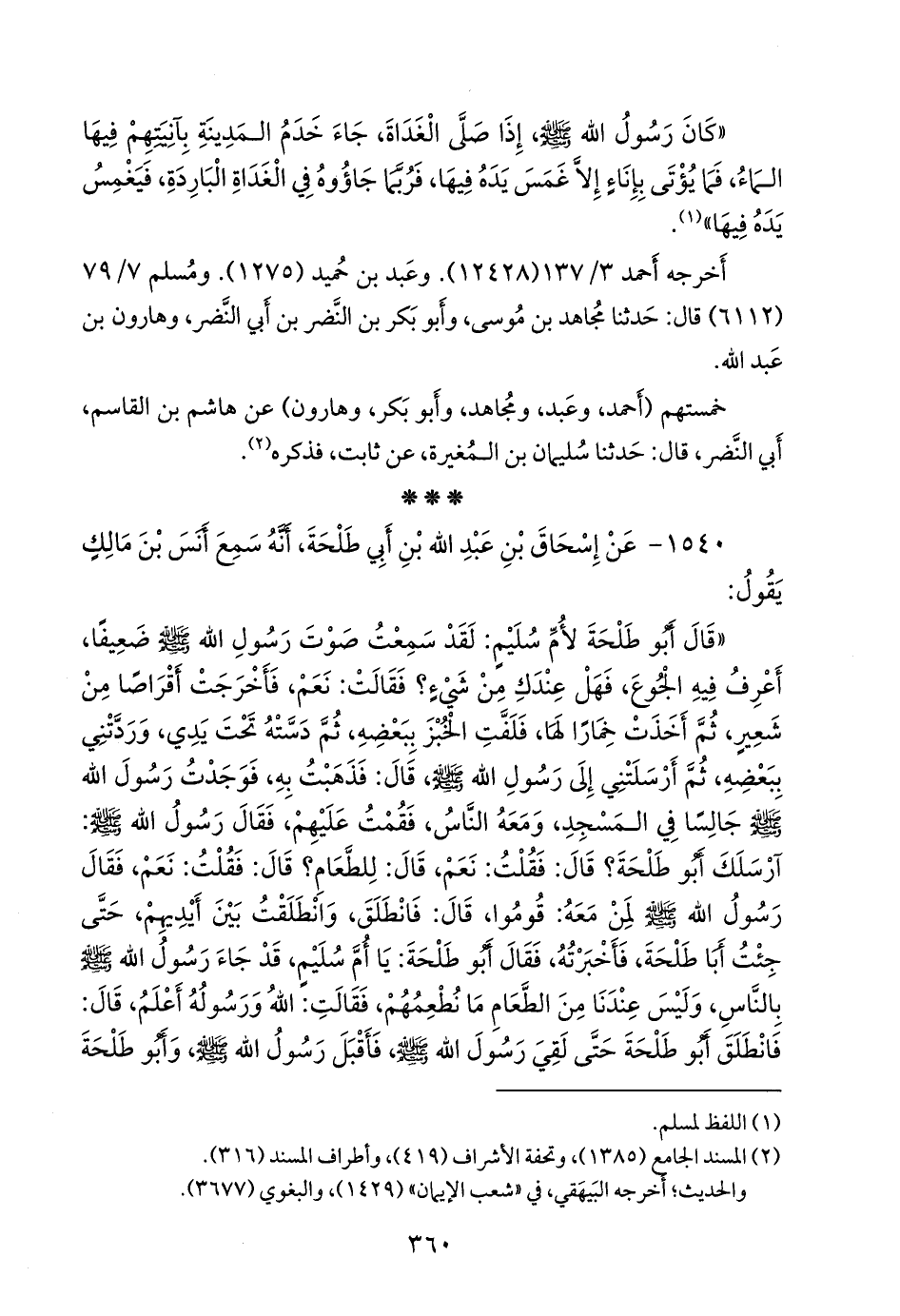 «قال أَبو طلحة لأُم سُليم: لقد سمعت صوت رسول الله صَلى الله عَليه وسَلم ضعيفا، أعرف فيه الجوع، فهل عندك من شيء؟ فقالت: نعم، فأخرجت أقراصا من شعير، ثم أخذت خمارا لها، فلفت الخبز ببعضه، ثم دسته تحت يدي، وردتني ببعضه، ثم أرسلتني إلى رسول الله صَلى الله عَليه وسَلم قال: فذهبت به، فوجدت رسول الله صَلى الله عَليه وسَلم جالسا في المسجد، ومعه الناس، فقمت عليهم، فقال رسول الله صَلى الله عَليه وسَلم: آرسلك أَبو طلحة؟ قال: فقلت: نعم، قال: للطعام؟ قال: فقلت: نعم، فقال رسول الله صَلى الله عَليه وسَلم لمن معه: قوموا، قال: فانطلق، وانطلقت بين أيديهم، حتى جئت أبا طلحة، فأخبرته، فقال أَبو طلحة: يا أُم سُليم، قد جاء رسول الله صَلى الله عَليه وسَلم بالناس، وليس عندنا من الطعام ما نطعمهم، فقالت: الله ورسوله أعلم، قال: فانطلق أَبو طلحة حتى لقي رسول الله صَلى الله عَليه وسَلم فأقبل رسول الله صَلى الله عَليه وسَلم وأَبو طلحة