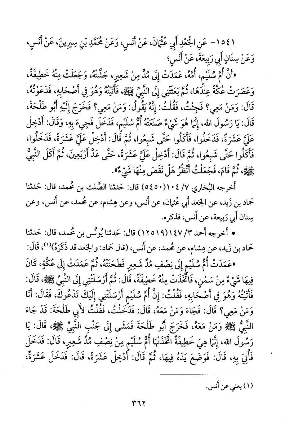 «عمدت أُم سُليم إلى نصف مد شعير فطحنته، ثم عمدت إلى عكة، كان فيها شيء من سمن، فاتخذت منه خطيفة، قال: ثم أرسلتني إلى النبي صَلى الله عَليه وسَلم قال: فأتيته وهو في أصحابه، فقلت: إن أُم سُليم أرسلتني إليك تدعوك، فقال: أنا ومن معي؟ قال: فجاء ومن معه، قال: فدخلت، فقلت لأبي طلحة: قد جاء النبي صَلى الله عَليه وسَلم ومن معه، فخرج أَبو طلحة فمشى إلى جنب النبي صَلى الله عَليه وسَلم قال: يا رسول الله، إنما هي خطيفة اتخذتها أُم سُليم من نصف مد شعير، قال: فدخل فأتي به، قال: فوضع يده فيها، ثم قال: أدخل عشرة، قال: فدخل عشرة،