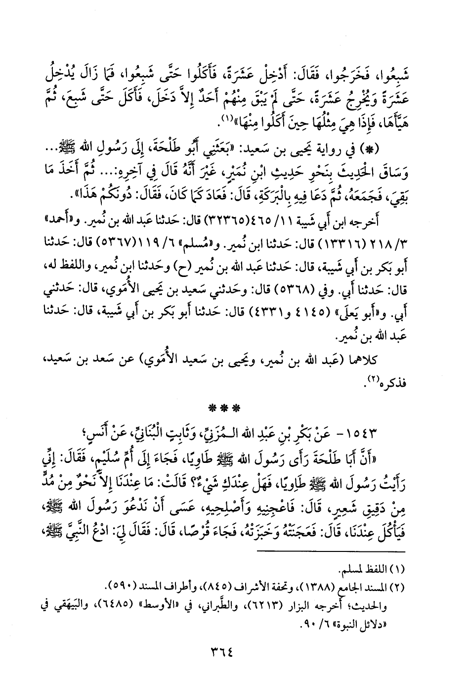 - في رواية يحيى بن سعيد: «بعثني أَبو طلحة، إلى رسول الله صَلى الله عَليه وسَلم ... وساق الحديث بنحو حديث ابن نُمير، غير أنه قال في آخره: ... ثم أخذ ما بقي، فجمعه، ثم دعا فيه بالبركة، قال: فعاد كما كان، فقال: دونكم هذا».
