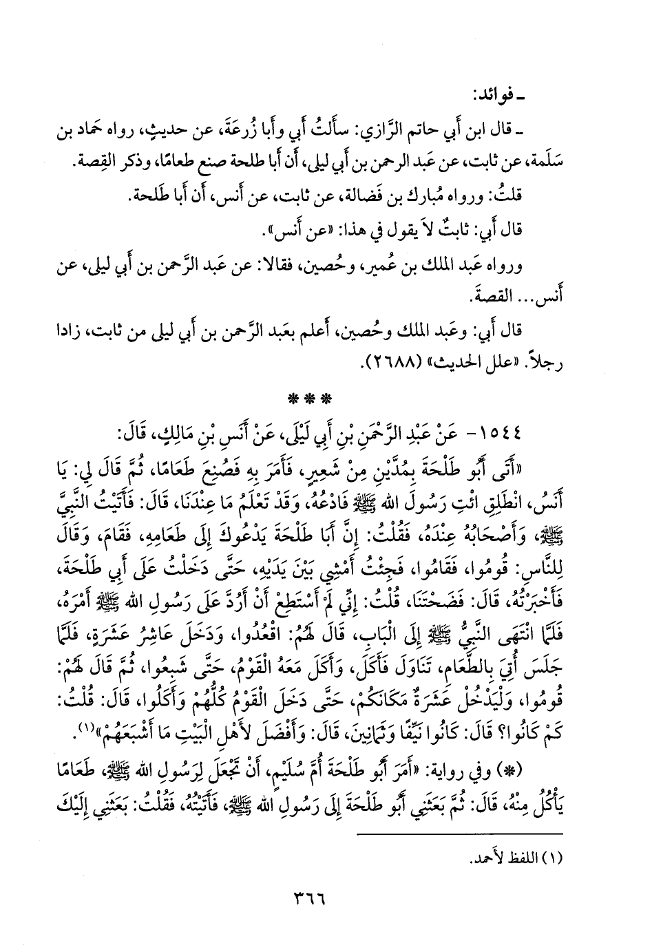 - وقال ابن أبي حاتم الرازي: سألت أبي وأَبا زُرعَة، عن حديث، رواه حماد بن سلمة، عن ثابت، عن عبد الرَّحمَن بن أبي ليلى، أن أبا طلحة صنع طعاما، وذكر القصة.