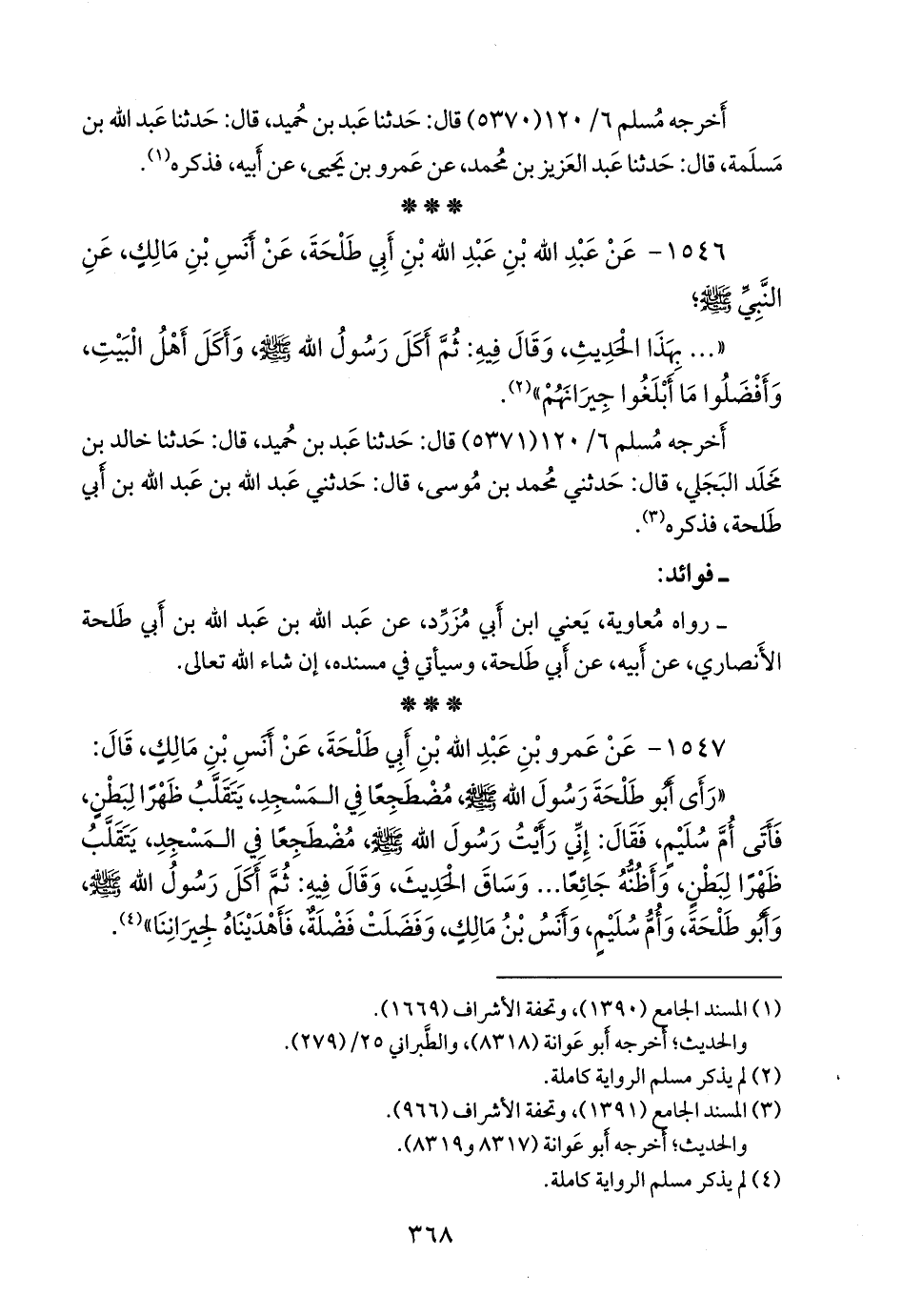 - رواه معاوية، يعني ابن أَبي مُزَرِّد، عن عبد الله بن عبد الله بن أَبي طلحة الأَنصاري، عن أَبيه، عن أَبي طلحة، وسيأتي في مسنده، إِن شاء الله تعالى.