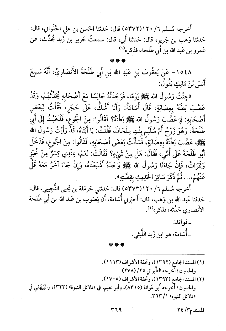 «جئت رسول الله صَلى الله عَليه وسَلم يوما، فوجدته جالسا مع أصحابه يحدثهم، وقد عصب بطنه بعصابة، قال أُسامة: وأنا أشك، على حجر، فقلت لبعض أصحابه: لم عصب رسول الله صَلى الله عَليه وسَلم بطنه؟ فقالوا: من الجوع، فذهبت إلى أبي طلحة، وهو زوج أُم سُليم بنت مِلْحَان، فقلت: يا أبتاه، قد رأيت رسول الله صَلى الله عَليه وسَلم عصب بطنه بعصابة، فسألت بعض أصحابه، فقالوا: من الجوع، فدخل أَبو طلحة على أمي، فقال: هل من شيء؟ فقالت: نعم، عندي كسر من خبز وتمرات، فإن جاءنا رسول الله صَلى الله عَليه وسَلم وحده أشبعناه، وإن جاء آخر معه قل عنهم، ... ثم ذكر سائر الحديث بقصته».