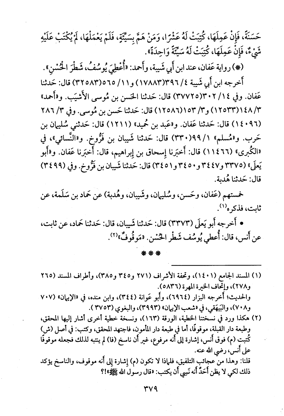 (¬٢) هكذا ورد في نسختنا الخطية، الورقة (١٦٣)، ونسخة خطية أخرى أشار إليها المحقق، وطبعة دار القبلة، موقوفًا، أما في طبعة دار المأمون، فاجتهد المحقق, وكتب: في أصل (ش) كتبت (م) فوق أنس، إشارة إلى أنه مرفوع، غير أن ناسخ (فا) لم ينتبه لذلك فجعله موقوفا على أنس، رضي الله عنه.